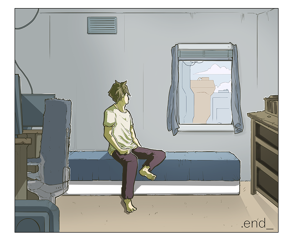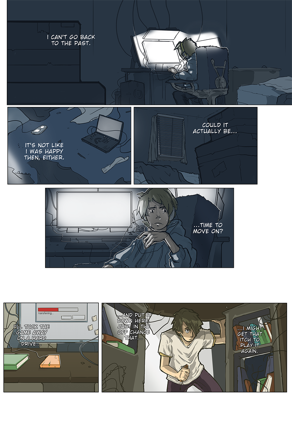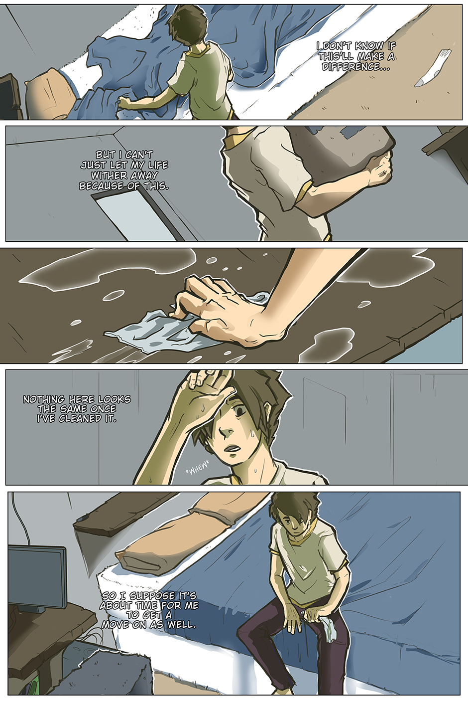 Wow. I am so impressed by this little comic. I seriously felt a twinge in my heart when he became so upset by his friends moving on. It's definitely relatable for me and I think that's what got me. That ending panel is so great though. Bright, clean room and a new start. Just wonderful work!
