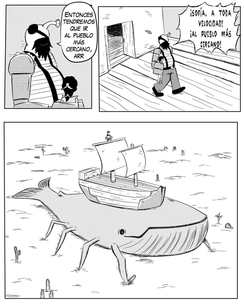 Algo divertido de hacer estos proyectos colaborativos es que te topas con sorpresas como esta. En qué momento a mí se me habría ocurrido dibujar una ballena con patas de araña caminando sobre un desierto y transportando un barco sobre sí? xd