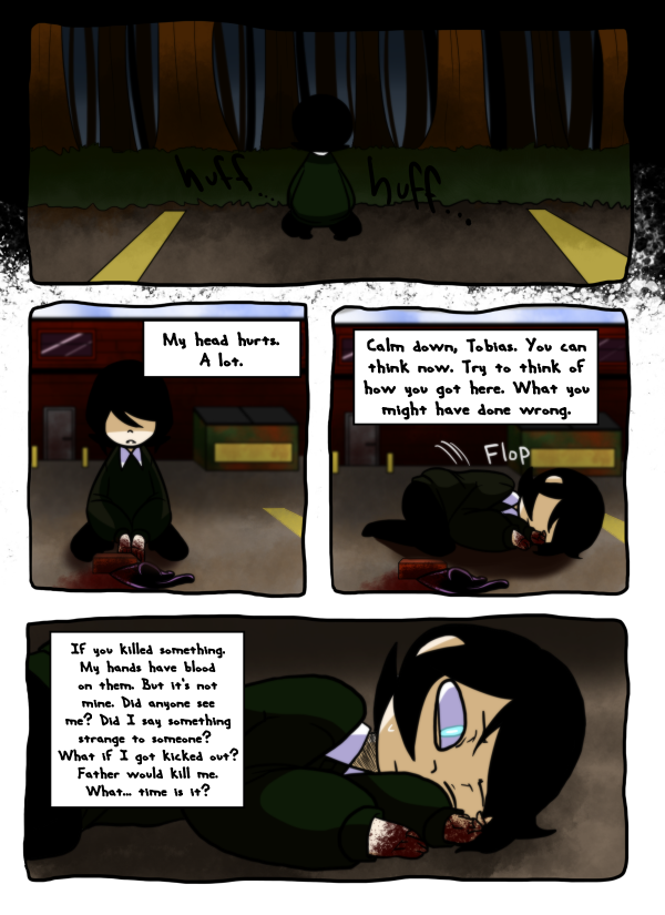 Tobias Schneien is a boy of 15 who's been homeschooled his whole life until now. Raised in a church in the woods with his many siblings, tentative mother, and religious father, he is wrought with severe paranoia of being in public with peers by himself. His only comfort here are the voices in his head, the blade in his hands, and his god.
