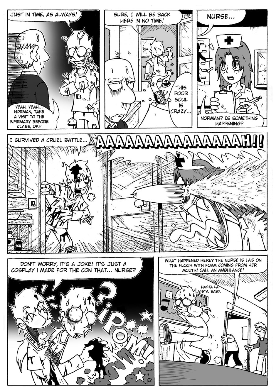 Entering throught the door like normal people? That are for loosers! Real Geeks makes always sure they join in scene in the most epic way! Norman always carries with him a cosplay to fit in at the right situations... or maybe not. These pages have been translated by Naruedyoh.