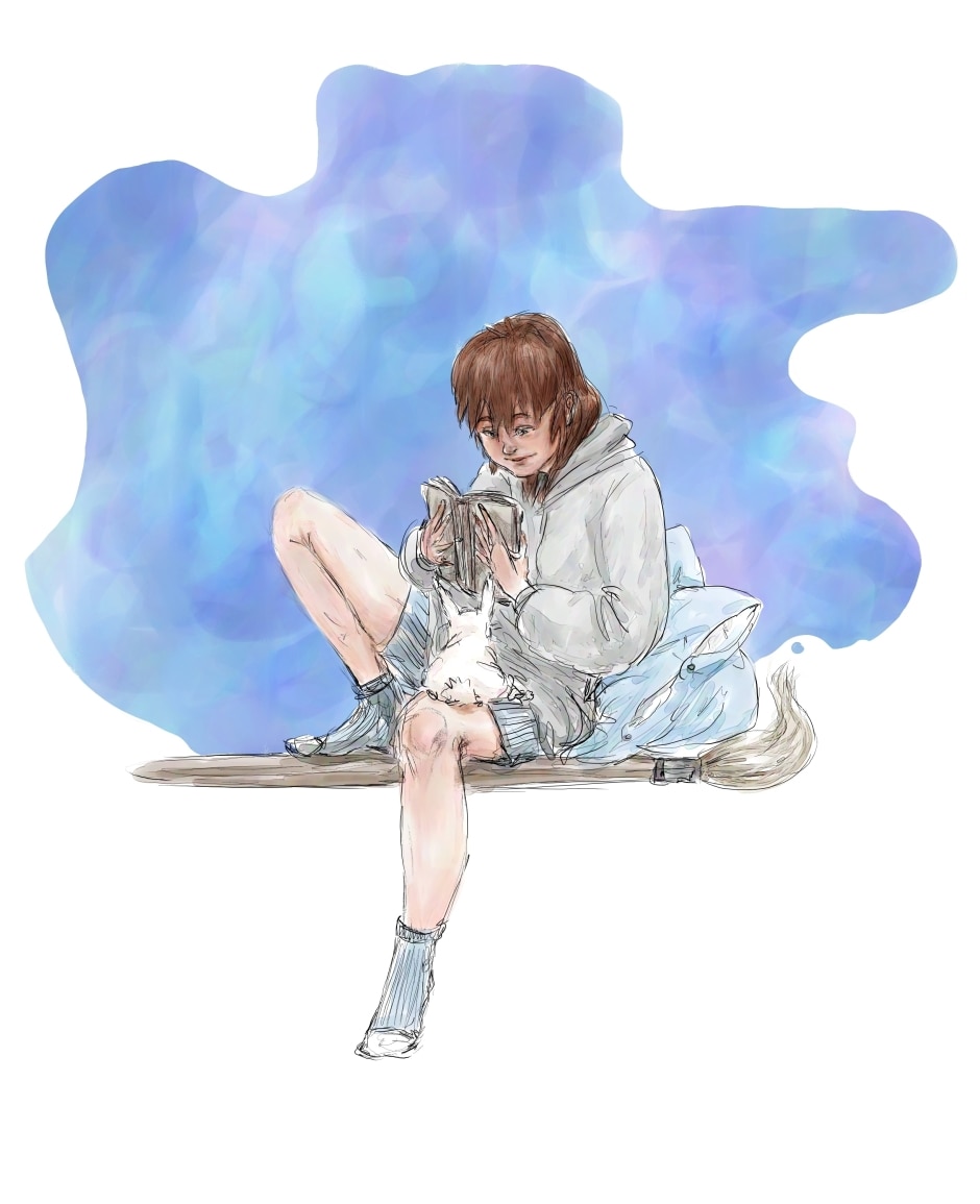 No idea why there's a rabbit. Maybe because art is like a rabbit hole. You fall and fall and bruise yourself and you don't really fit where you land, but the land is full of wonders?