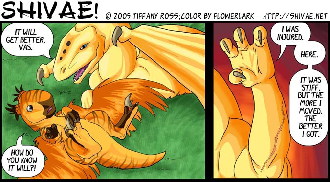 Now, Vas, is a shivae chick, a creature you can think of as a winged utahraptor if you like. They come in wingless variety too! You can also think of this as Bambi with Carnivores. Anyway, Vas has lost his mother and several of his nestmates to 'newcomers', the invading Cyantian people. Cyantians are anthro creatures who are new to their world and now, Vas, his father, Triv and brother Riva are seeking out new lands to live in, free of the invading Cyantians.