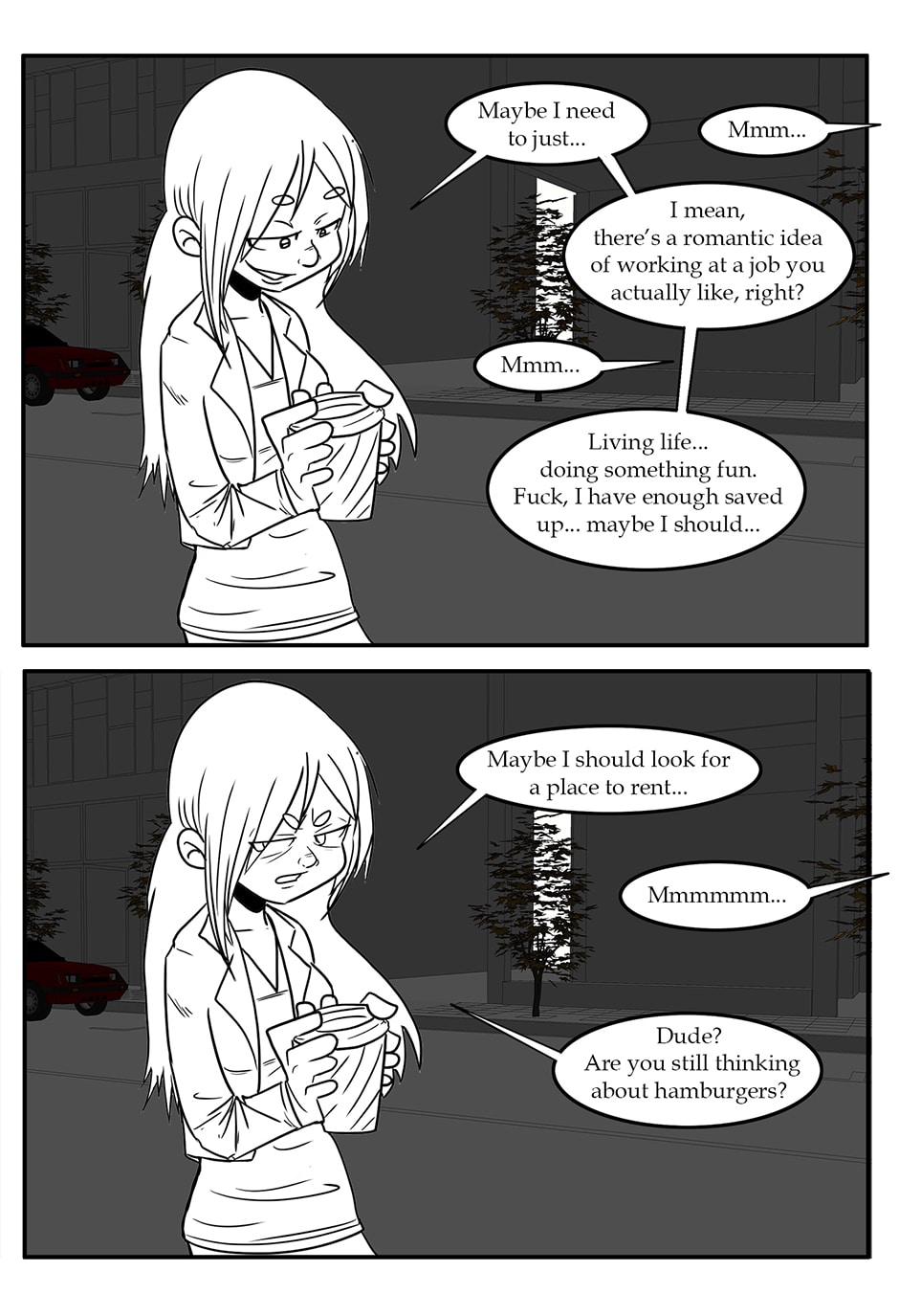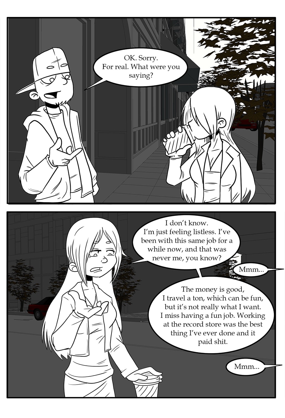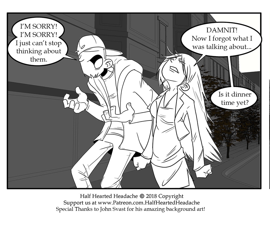 ARC 2 of Half Hearted Headache follows a slice of life story about unlikely friends in the small city town of Elgin, IL. Following the day to day lives of people, their interests, and their relationships. Plus a talking cat... and a ghost... and mysteries galore!