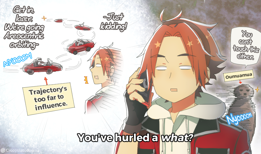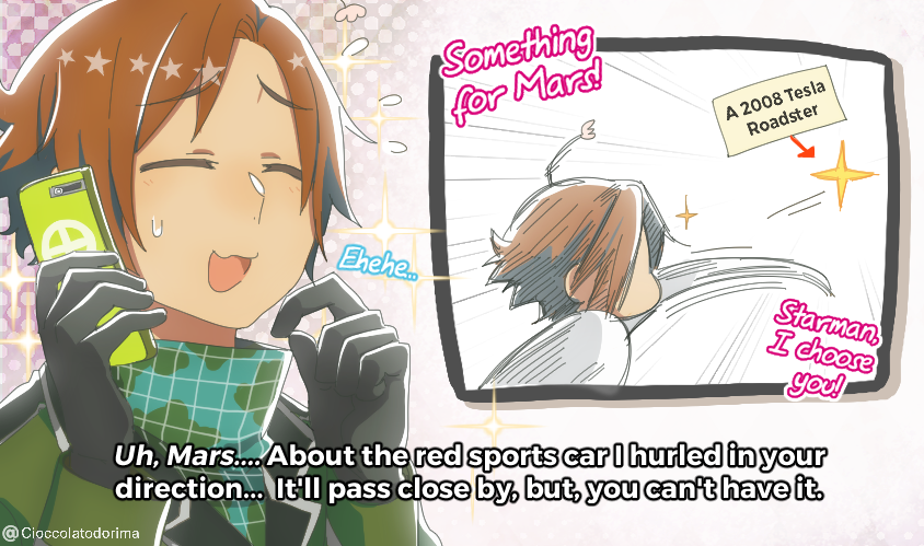 A Planetary Moe short skit about the Tesla Roadster sent into space using SpaceX’s Falcon Heavy rocket featuring E-chan and Mars. Bonus info as well for Oumuamua!