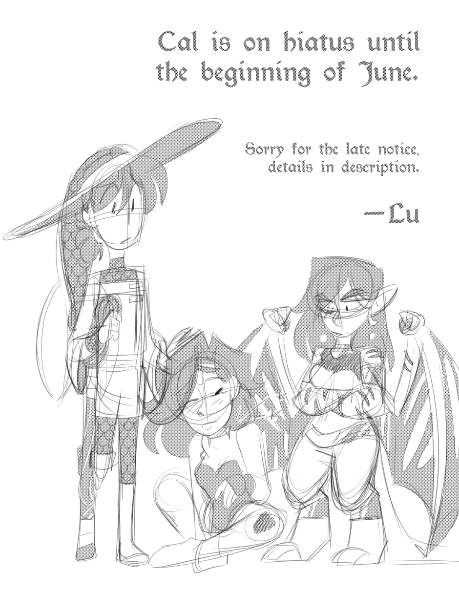Sorry for the short notice. On Wednesday [the 21st] I was in a not really minor car accident. I'm alright, mostly just bruised, but it's making it uncomfortable to sit and work for too long. I'm planning on taking the next two months off to recover but I'll still be working on pages, just at a slower pace.
