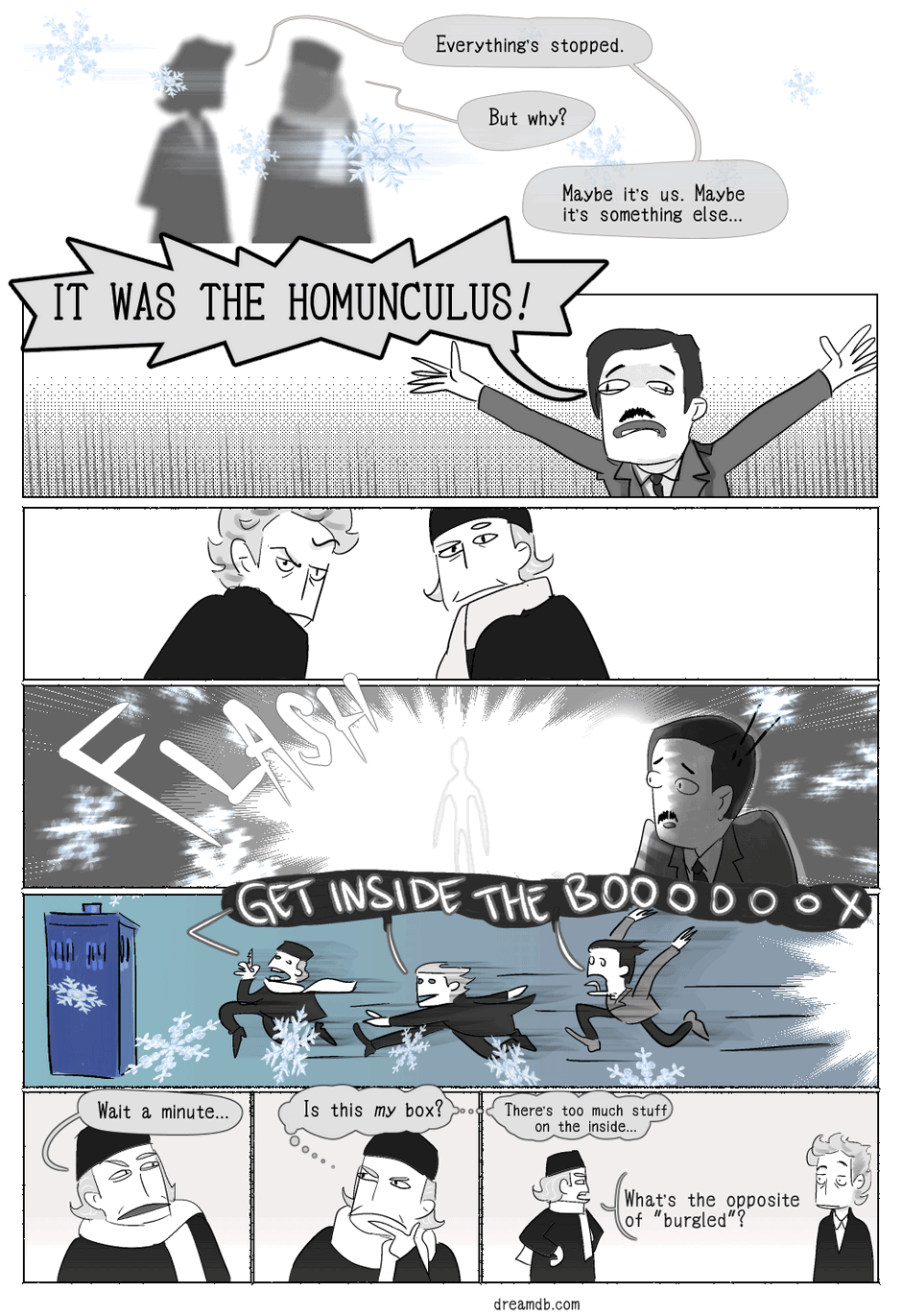 I started drawing parody fan fiction a few years ago because I loved Peter Capaldi's Doctor but hated Moffat's writing. I started with s08e01, but I haven't finished that one yet (oops), so here's the most recent stuff.