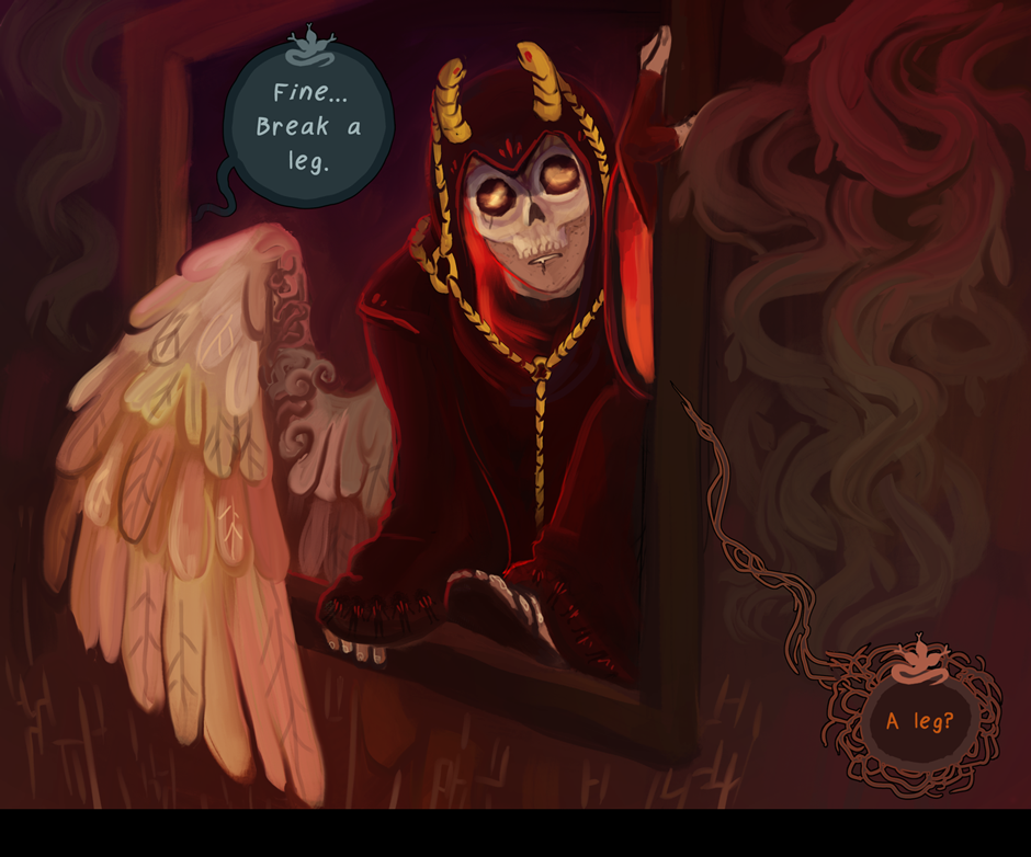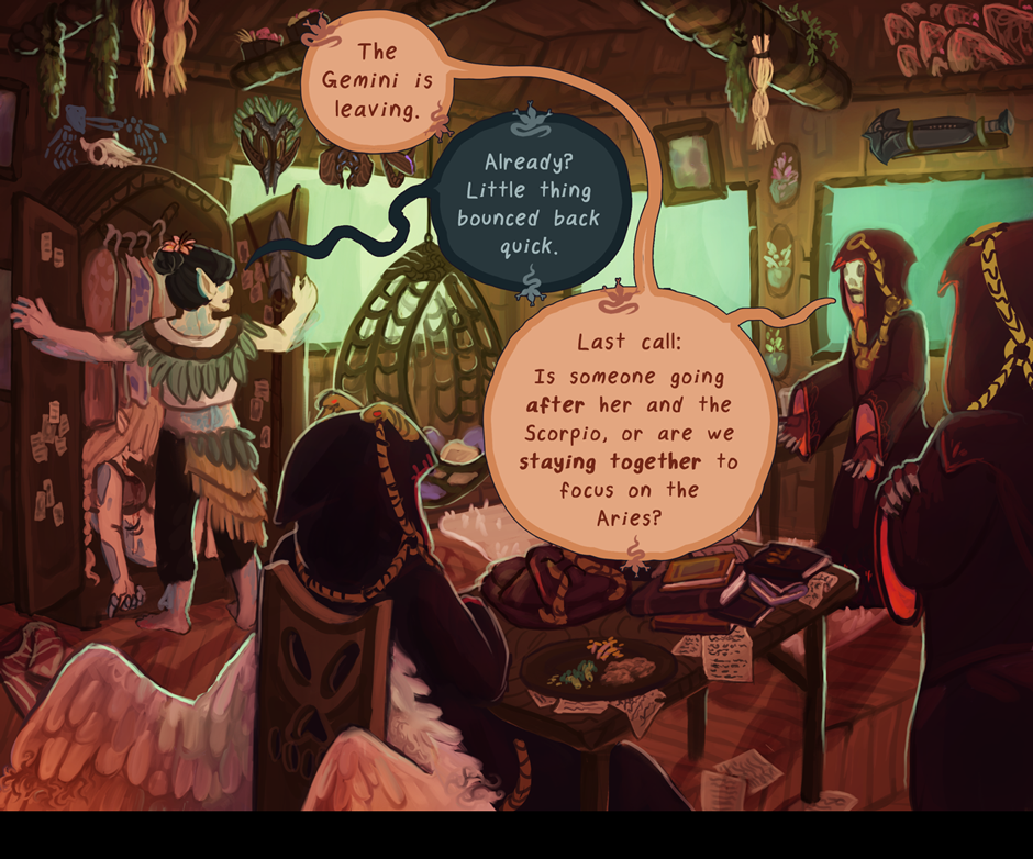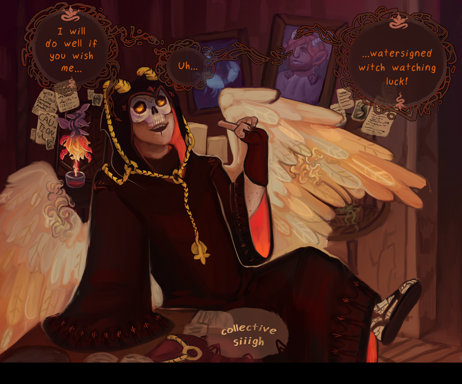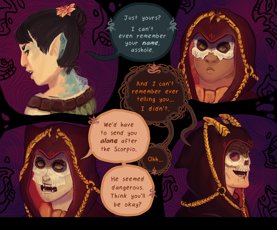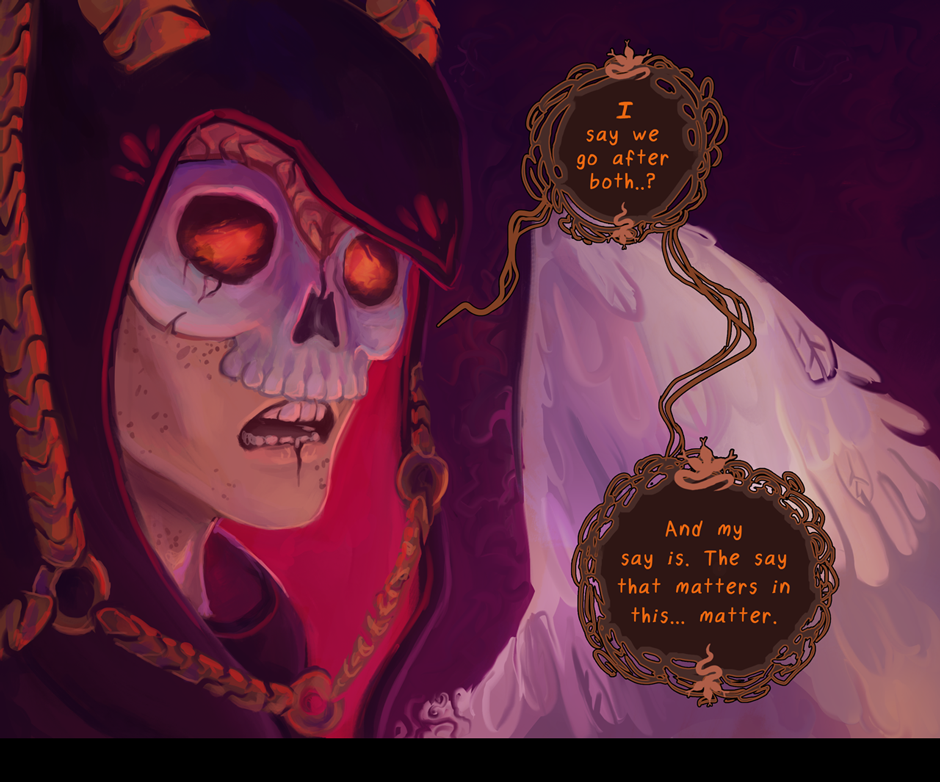 - Ryvia and Kho's first conversation, which no longer mentions Ryv's parents and instead focuses on how to the two feel very differently about witchcraft. (also they got 2 more chibi panels because that's always good)