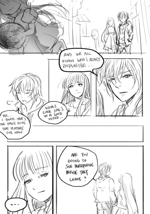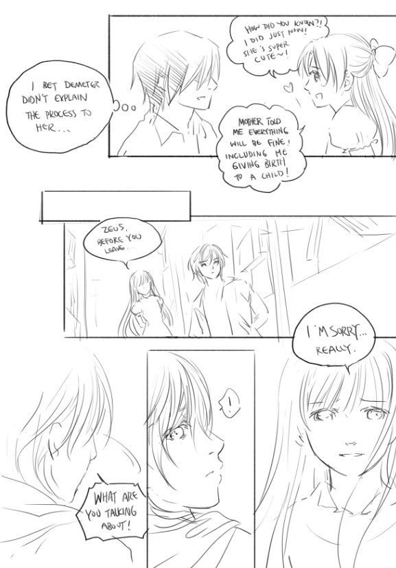 Demeter loved Hades but because her father was Cronus (a ruler who didn’t love her) couldn’t risk sex with him because if she had children she would loose her divine essence and die and she didn’t want Hades to feel responsible for her death. So she came up with a plan to have a child with Zeus since that child could be loved by Hades and even have kids because of his status. Zeus, however made a promise (in the story titled The Promise) to always hate Hades and as such if Hades knew he did the thing with Demeter it would be “breaking” the promise to him. Hence the act between him and Demeter to make it look like Rape. Zeus WANTS Hades to hate him back (read the Promise for more) Complicating things further, and probably why they can’t just be honest with each other is the fact that Zeus is cursed by Gaia (who seems to be the source of fate in this story) to be unable to love or know love. Gaia messed with him because SOMEONE ELSE broke a promise and reciprocated love with him when Gaia did not want them to be together (Zeus’s first love Metis) as a result of ONE if the couple breaking their promise to Gaia (It’s implied that Metis was the only one who knew about it) Gaia punished BOTH members of the couple. This explains why if Zeus wants to do something nice for his brother Hades he has to be so roundabout about it. Because when he was upset and in pain and mourning he made a promise to “always hate him” and now if he doesn’t follow it out Gaia will take sadistic pleasure out of making things even more miserable for everyone.