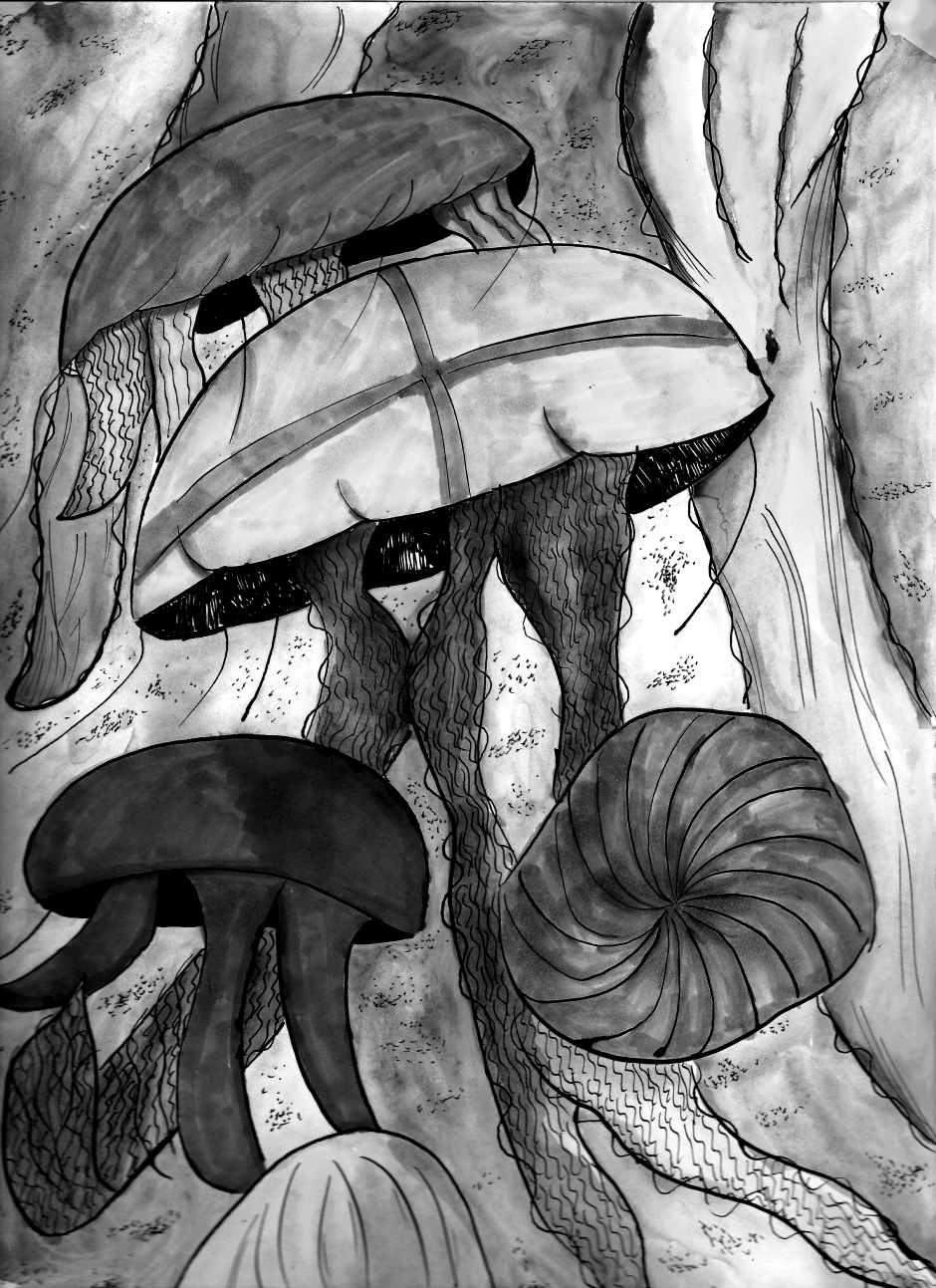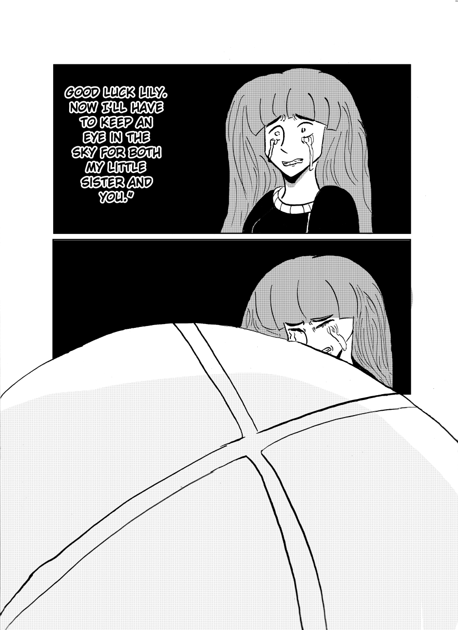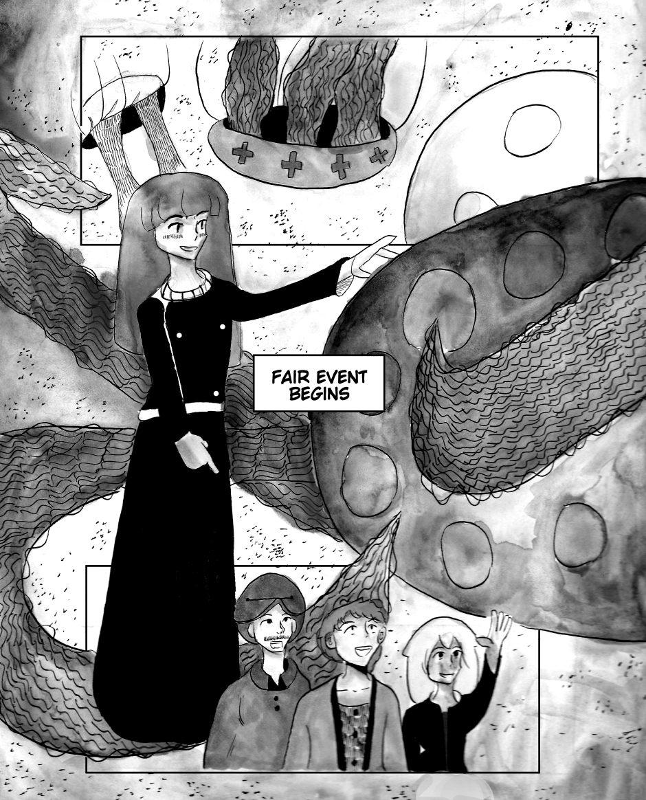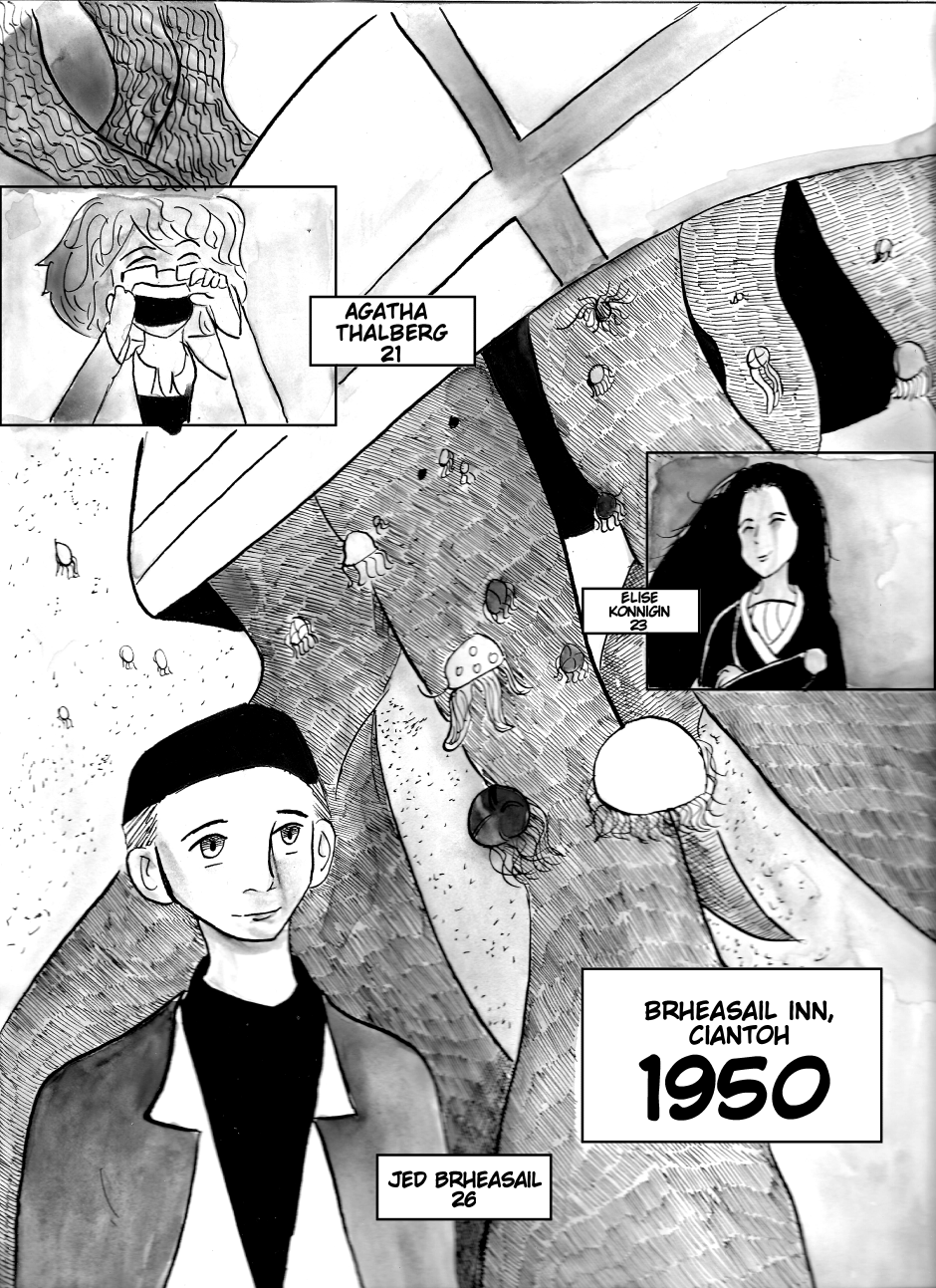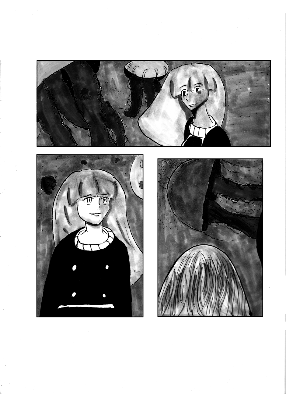 The flying jellyfish motif came to me while I was watching a Youtube tutorial on how to draw them, and the idea of watching giant versions of these sea creatures towering over humans spawned from there.