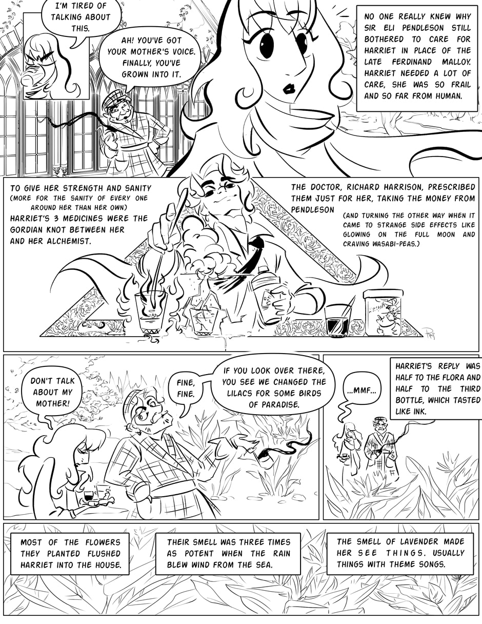This project was meant to help me with lineart (I'm more of a photoshop painter) so I decided to try out using a lot more width on this page than the other pages. Just to see if I liked it more than the other pages. Still am unsure.