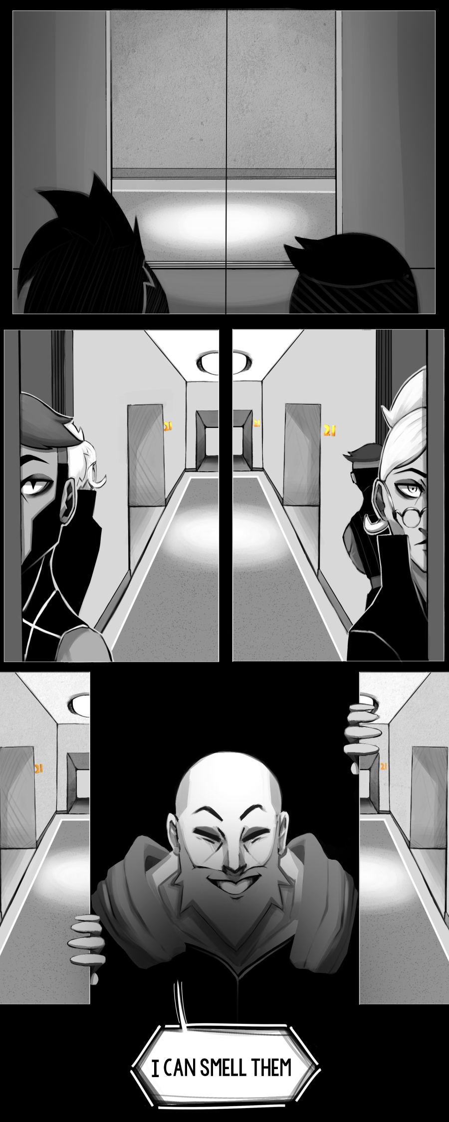 The team has checked the hallway and the big man emerges.