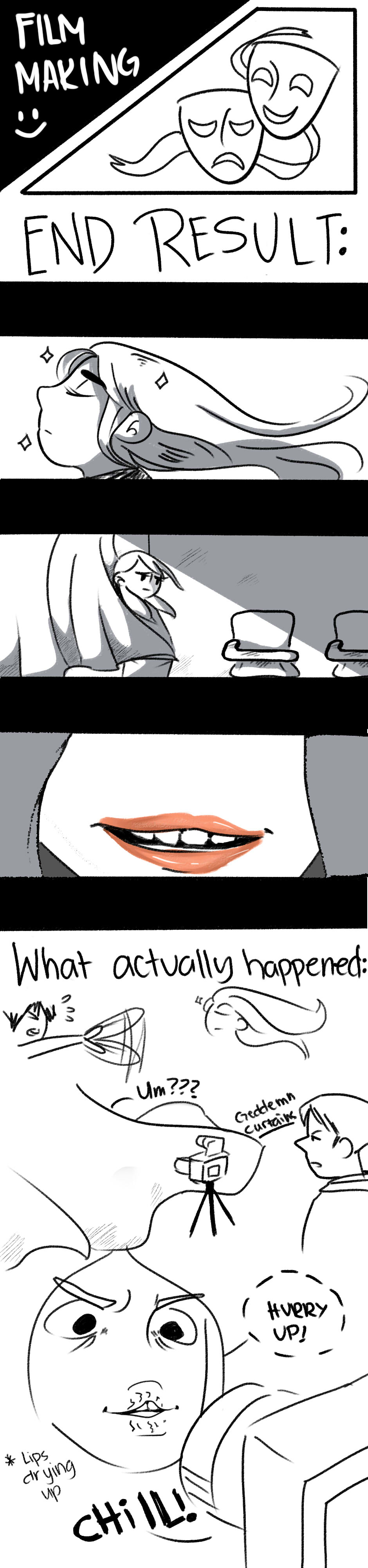 There's been a lot of instances in school lately where we have to make short films and I can really feel the stress and exhaustion film makers have to go through to make a film. AND OURS IS ONLY LIMITED TO 5 MINUTES.