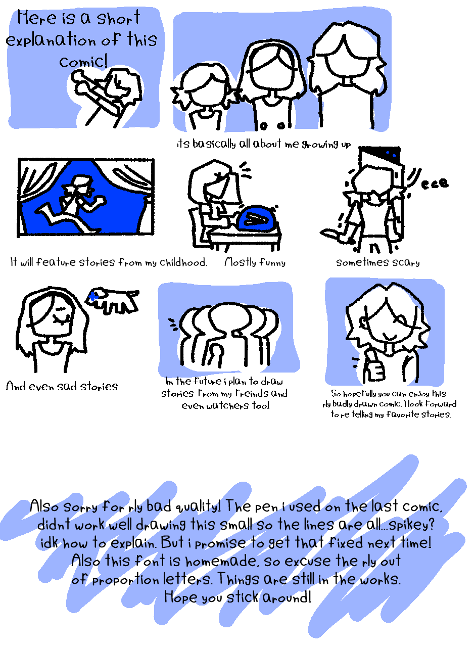 Last explanation page, from now on its all real comics! I plan to do either a scary/sad or funny comic first... I guess that doesn't rly help but whatever haha. I hope you guys enjoy!The next comic will be out later this week, or next week. Check profile for updates!