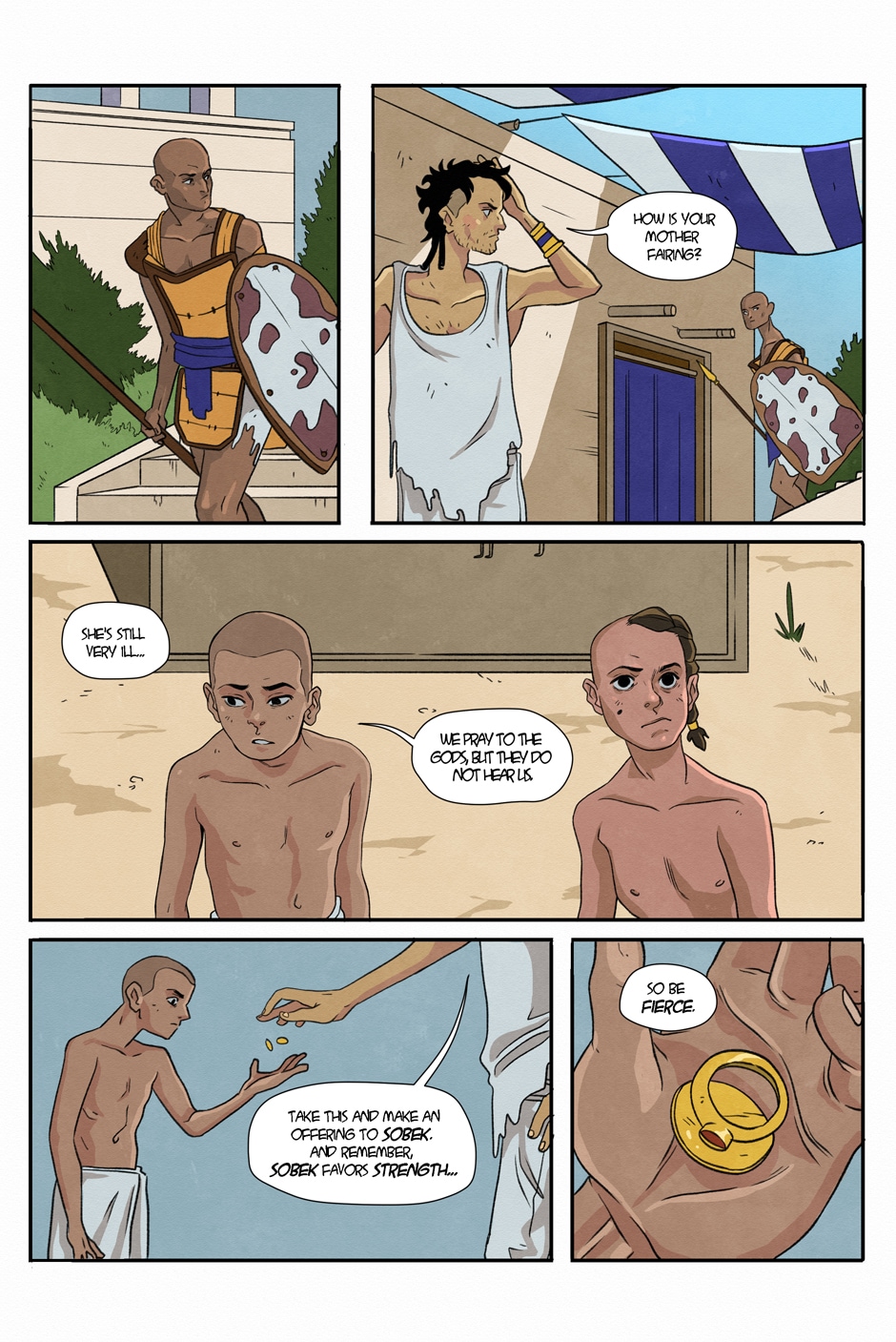 Sunpiercer takes place in Ancient Egypt, in the city of Waset (known today as Thebes). Set in the very beginning of Tutankhamen's reign as Pharaoh, Sunpiercer follows the crew of a fishing barge named "Sunpiercer". The fishermen of the barge are simple people, closely associated to a small Cult of Sobek just outside the city gates, but are drawn into political intrigue - and what will become a battle for their lives, as they are tasked to secretly retrieve an “artifact of the Gods” from a dangerous councilor of Tutankhamun’s father, the shamed Akhenaten. Unfortunately for our crew, they have very little idea of what exactly they’ve gotten themselves into.