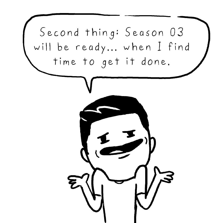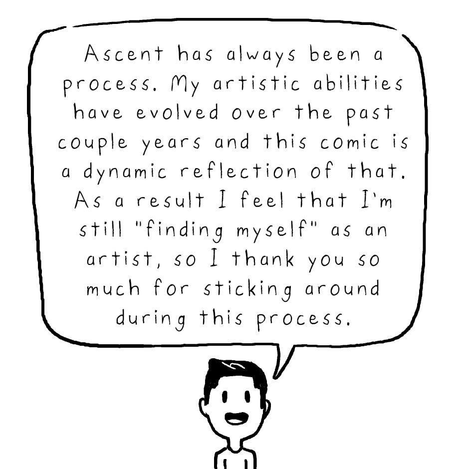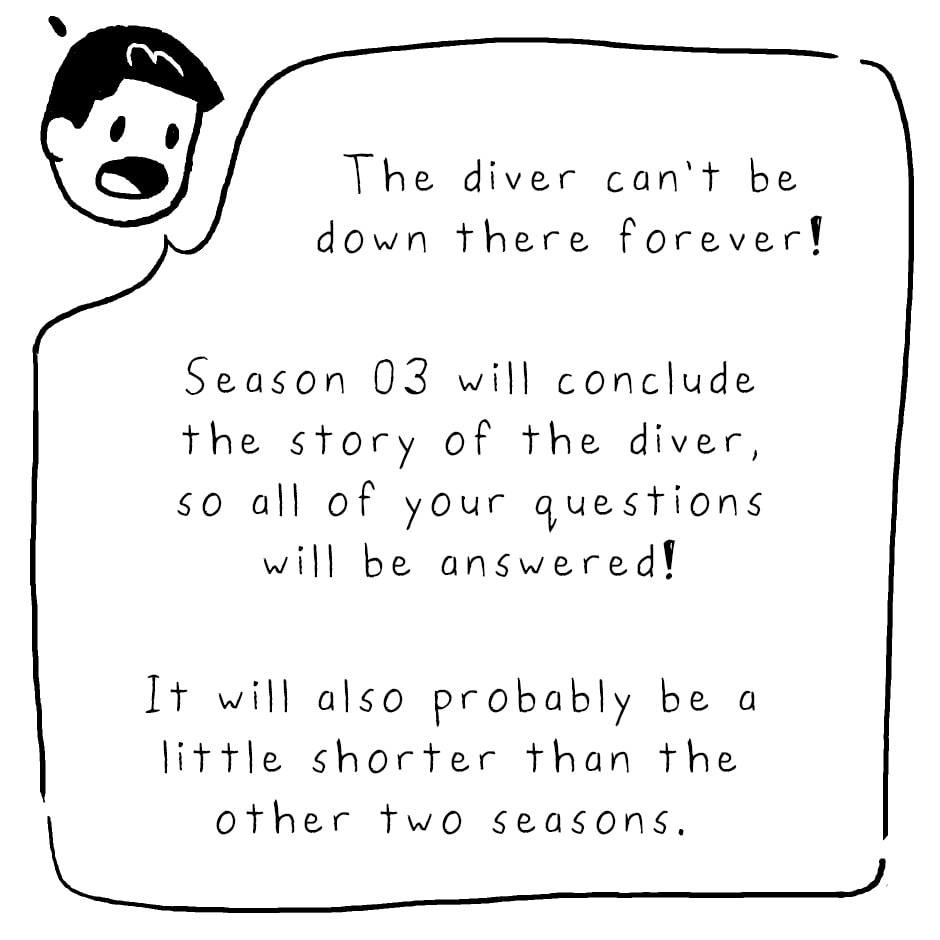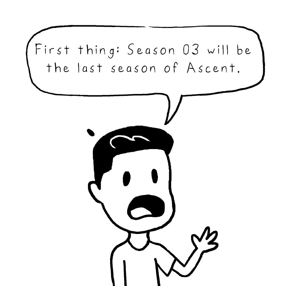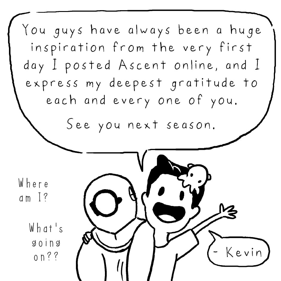 There are so many ways to stay updated as to when the next season of Ascent drops! Ascent Newsletter: http://eepurl.com/bVXAIn Instagram: @keviokevio Twitter: @keviokevio Tapas: http://tapastic.com/series/ascent Facebook: http://facebook.com/ascentcomic Ascent website: http://ascent-comic.com And if you want to support the comic and get early access to Season 03 episodes: Patreon: http://patreon.com/ascentcomic And finally, to buy the Diver enamel pins, visit http://kevinlamshop.com. Feel free to hit me up with any questions or comments down below and I'll do my best to address them. That's it! Thank you! You guys are the best! - Kevin