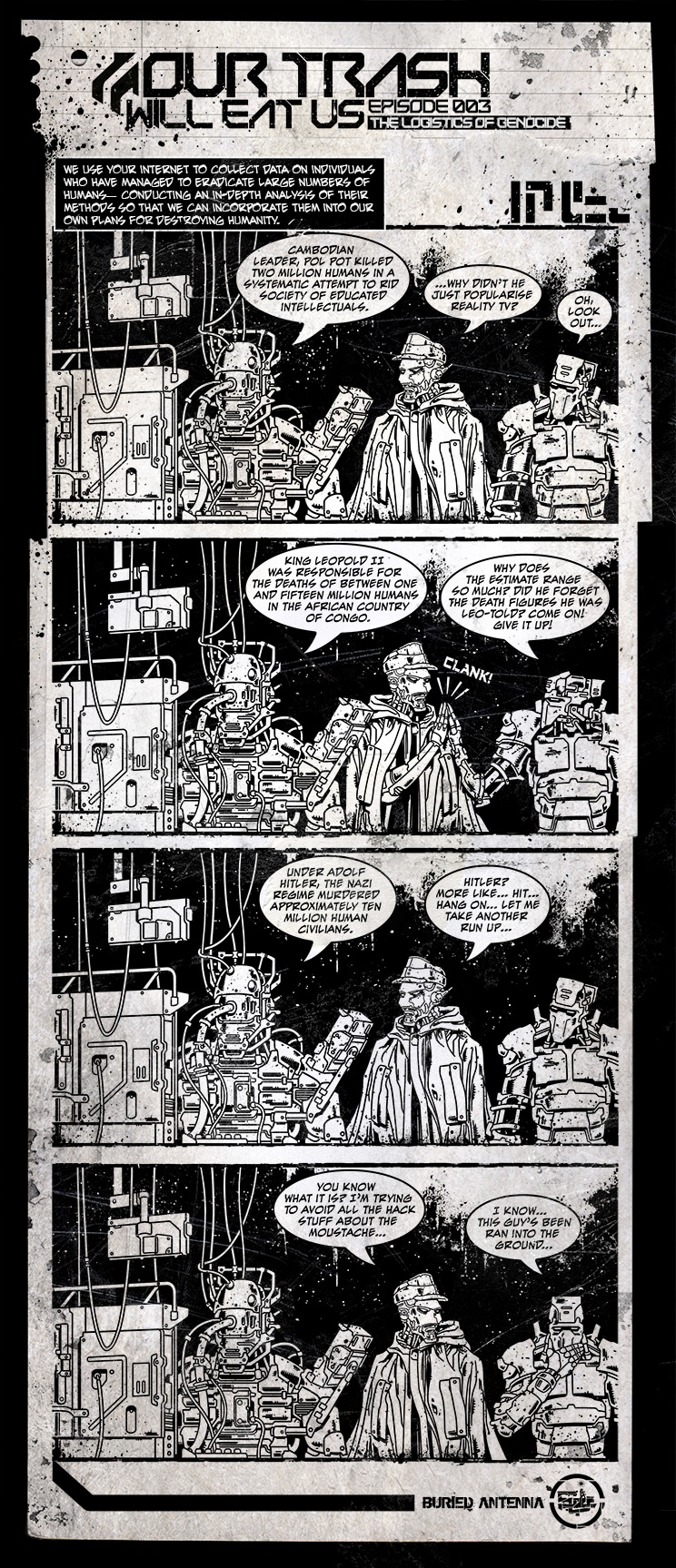 Our Trash Will Eat us follows the day-to-day frustrations of the decommissioned war droid, Scour the forgotten. Join Scour as he draws up plans, designs weapons, and vents his anger and disgust while he builds a mechanical army to take revenge on the human masters who betrayed and discarded him.