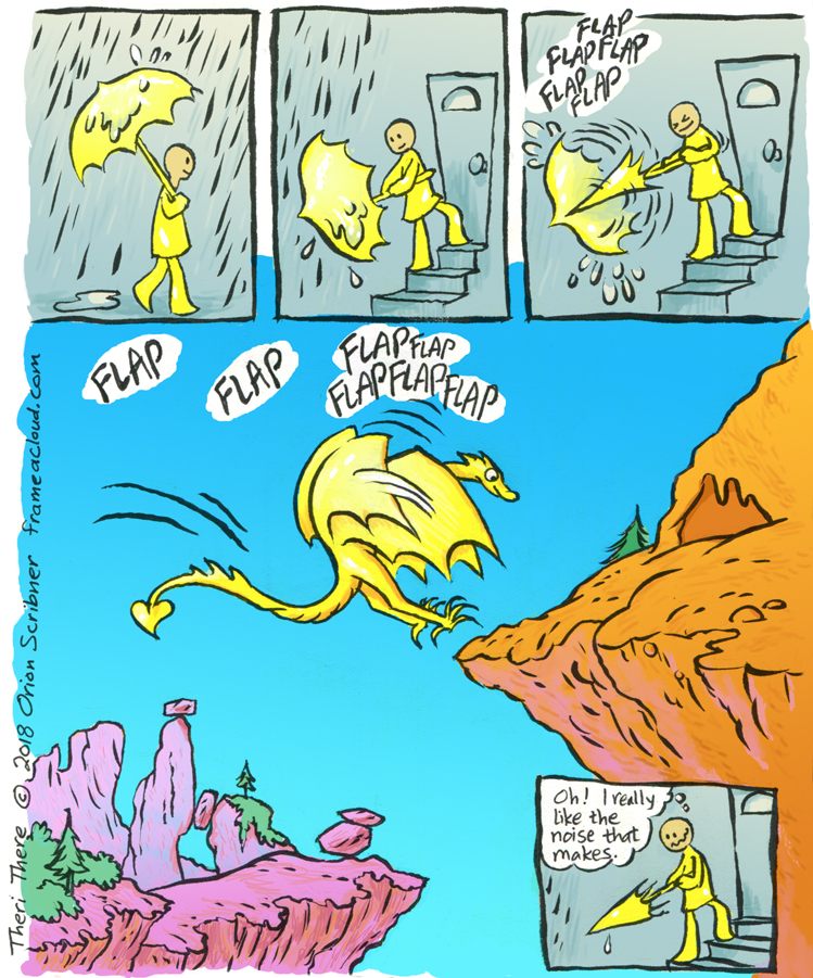 Panel 4: In another world, a yellow dragon cheerfully flies through blazing blue skies over purple canyons. As it approaches a cliff and a cave, it brakes for a landing: FLAP... FLAP... FLAP FLAP FLAP!