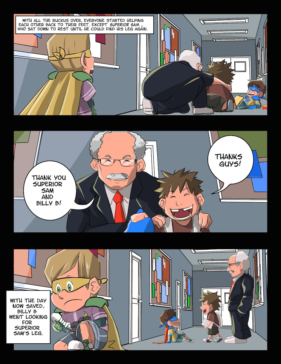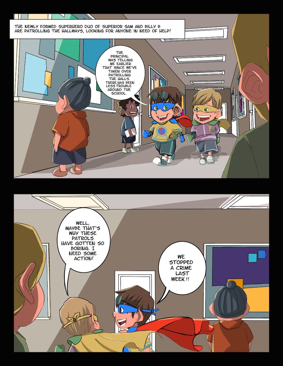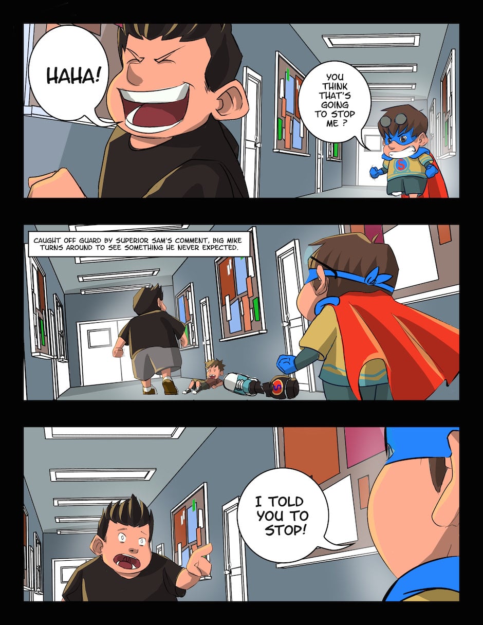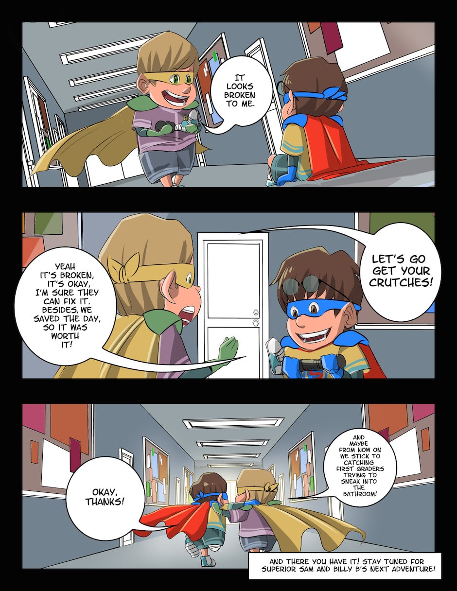 The Amazing Adventure of Superior Sam is an all-ages comic book series revolving around a little boy named Superior Sam who is an amputee superhero without any superpowers. With the help of his friends, they take on the bullies of the Bad Boys Club in an effort to make their school and town a better place. Each issue has a moral or a theme to it and they’re also designed in a way to teach new readers how to read comics without overwhelming them. Azami and I hope you enjoy the comics!