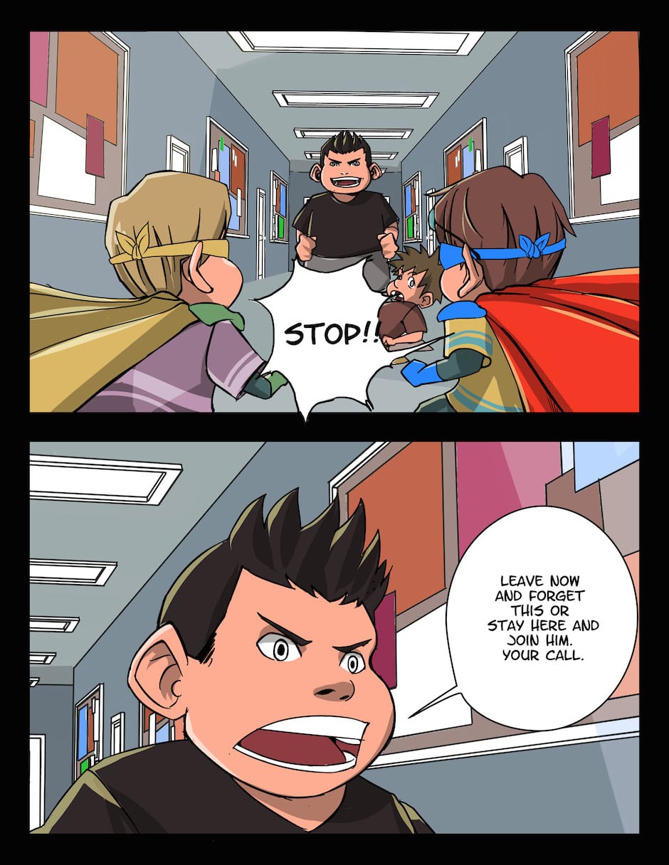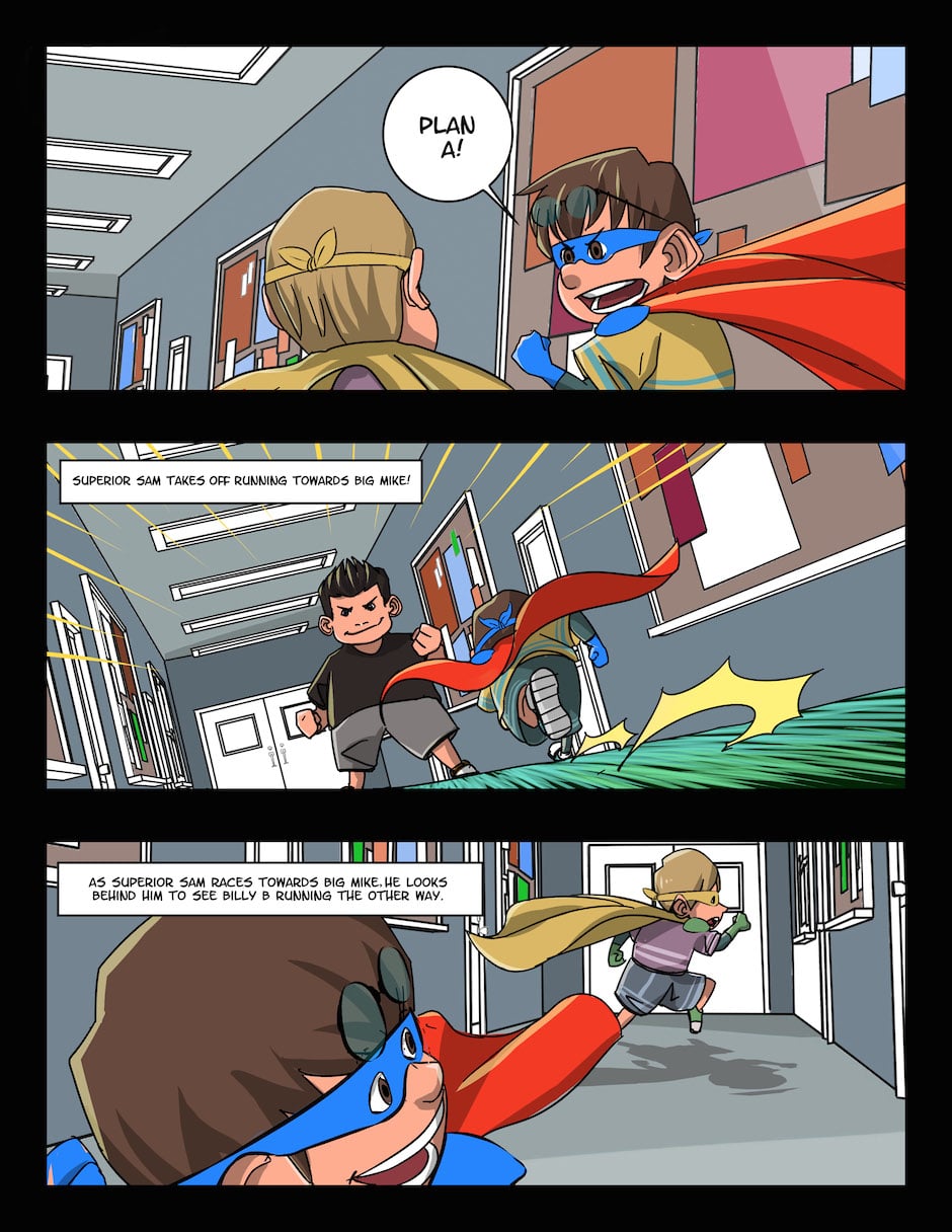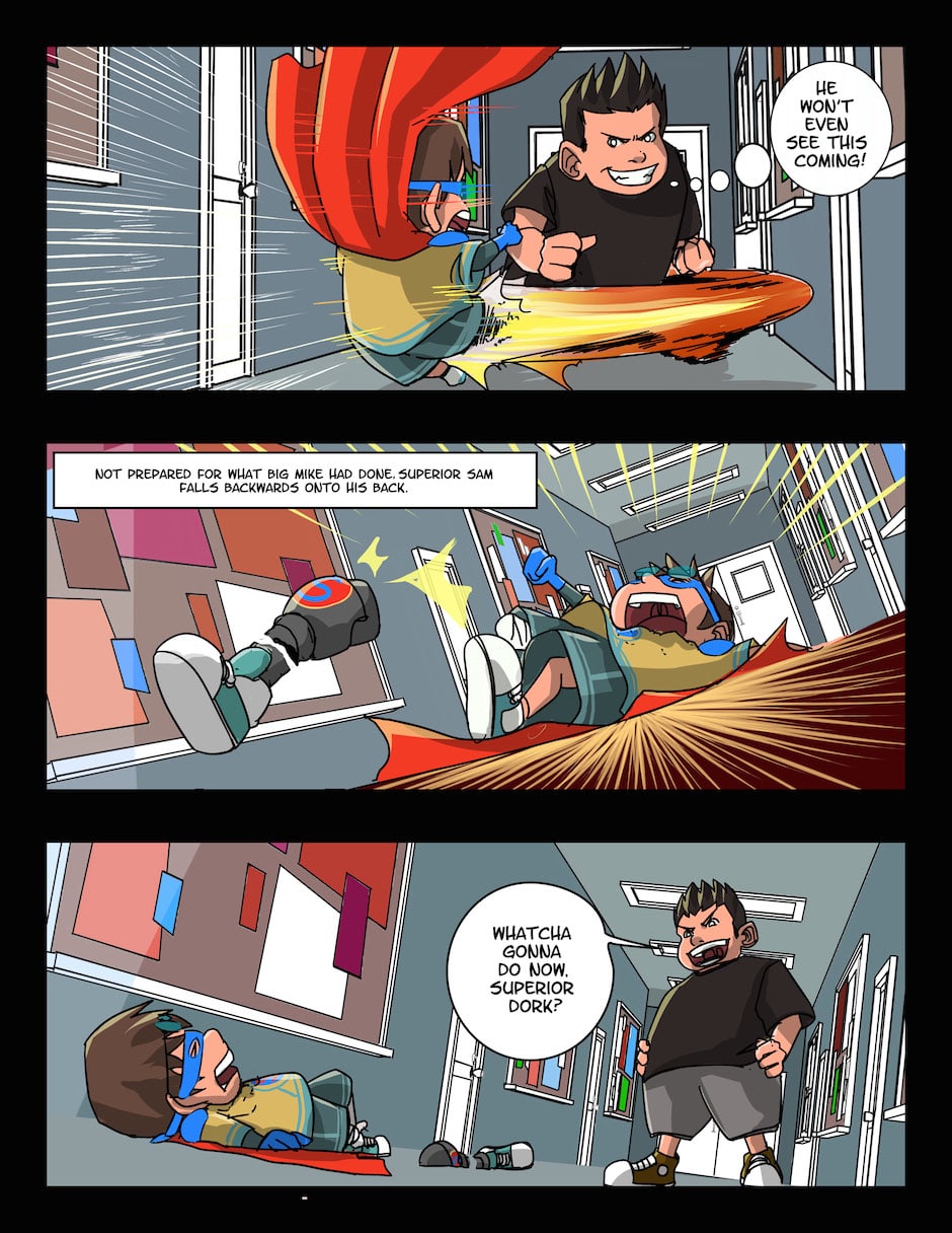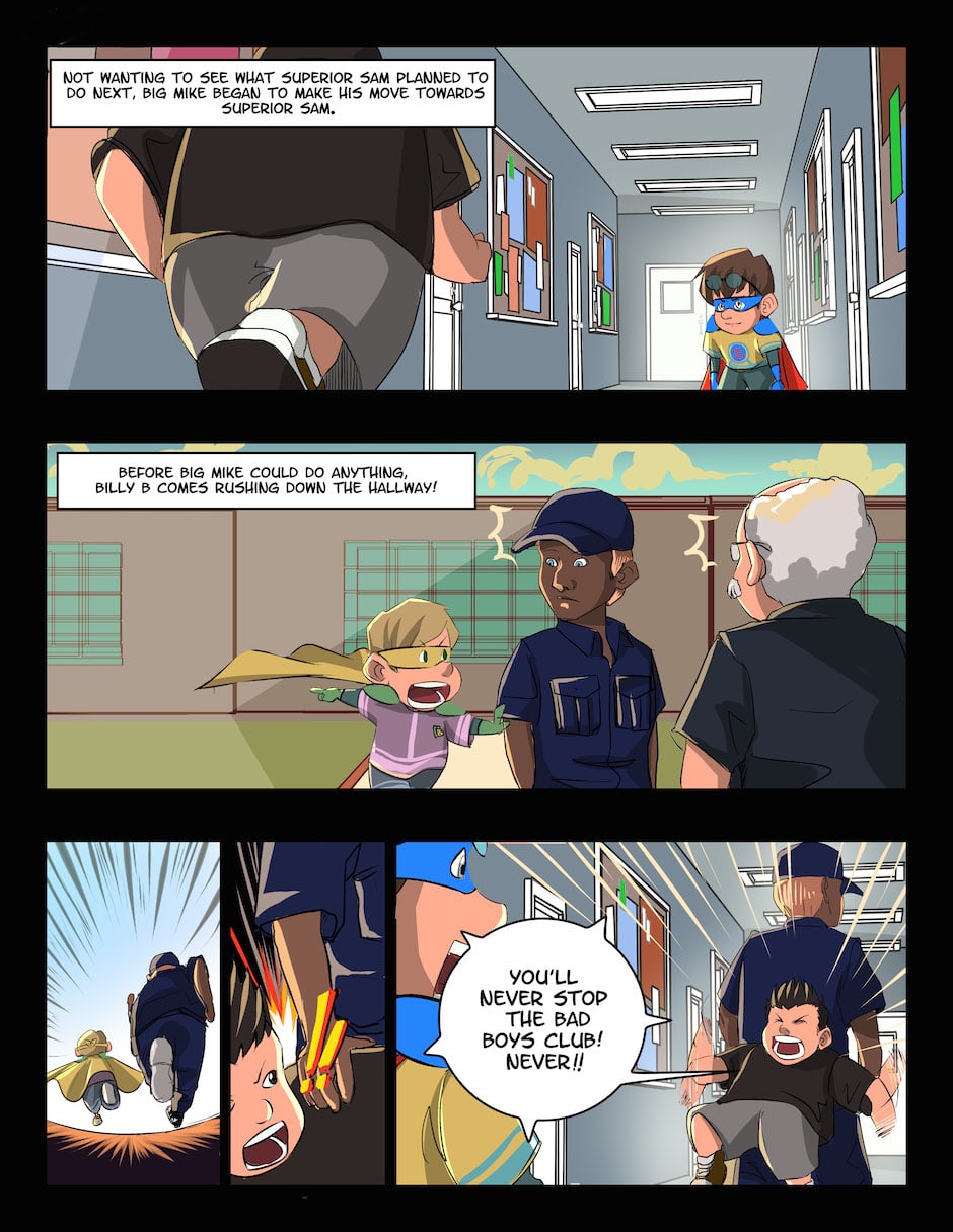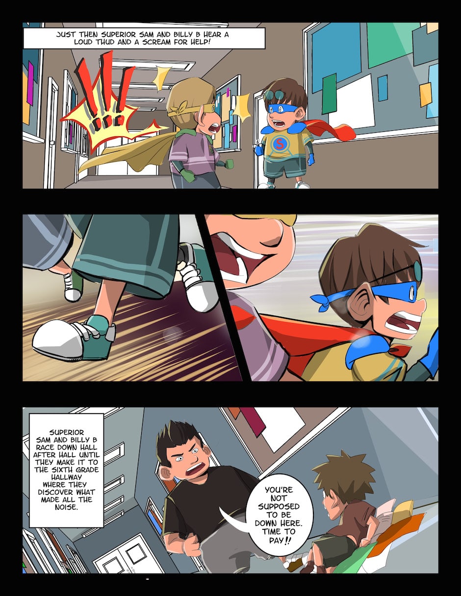 In this second issue, the newly formed duo of Superior Sam and Billy B take on their "First Test" in the likes of a school bully named Big Mike. But will Superior Sam and Billy B's first test be their last?