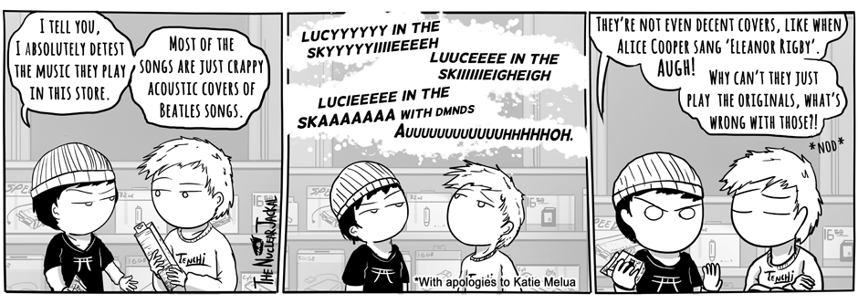 One of my jobs had the same tracklist playing every day, and a good chunk of it was just Beatles covers. I wish we were allowed to plug in to our phones instead xD I'd be plugged into Iron Maiden all day every day ;D