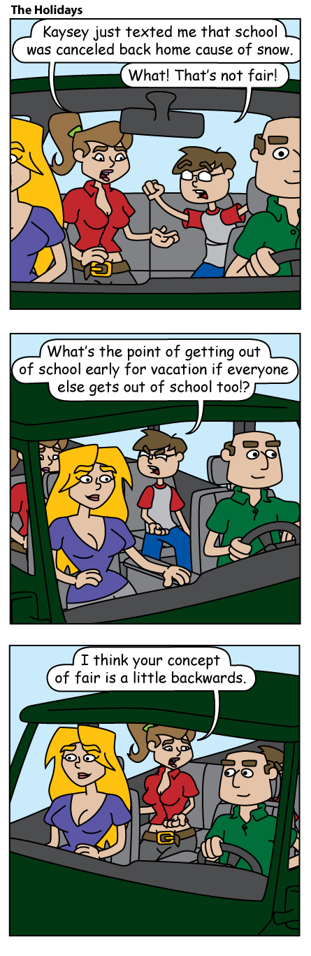 The Holidays is a family of four on vacation. They spend most of their time cooped up in the family car, and the rest of the time they fall victim to various tourist traps. Enjoy a dose of family fun every Friday with Harold, Helen, Hailey, and Harvey Holiday!