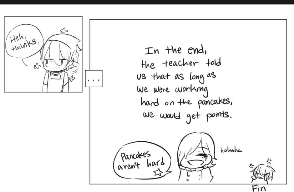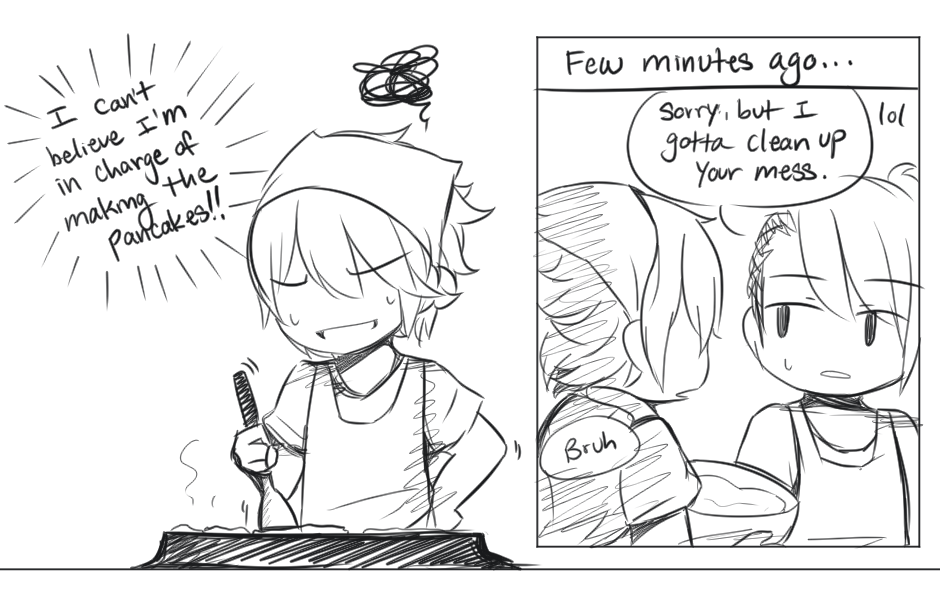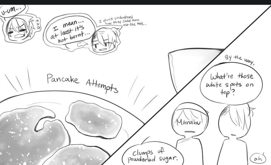 The thrilling conclusion to Manabu's pancake situation!! Long time no see! :D I believe it's been a couple of years, but if I realized I've never introduced Manabu's partner in these few episodes! His name is Luca. Baking sensei is such a troll. Manabu wonders why they're making pancakes when baking sensei is teaching, and the answer is simple, "If you can't even make simple pancakes, I don't trust you with actual baking!"