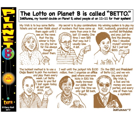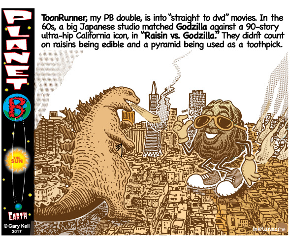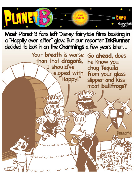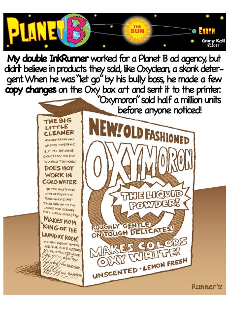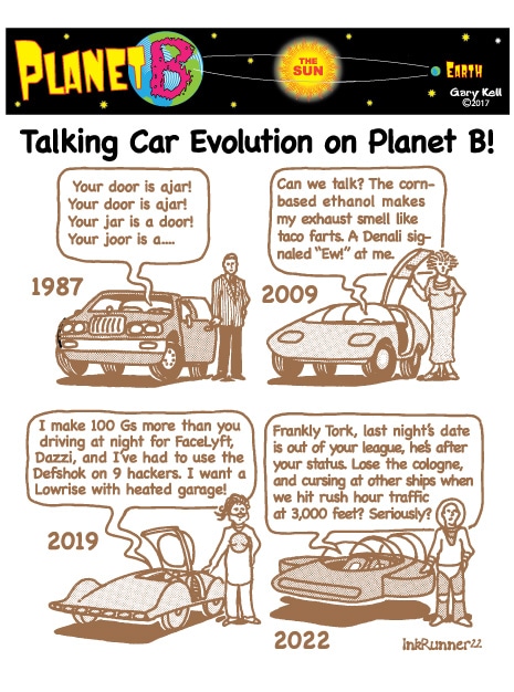Hi folks, I'm Gary, underpaid Mill Valley Valley cartoonist. Last week, bored, I emailed myself, asking for ideas, and received dozens of brown-tinted toons from my double on Planet B, also Gary, but he calls himself InkRunner! It's 2028 there and his stuff is good, futuristic, funny, time-bending and daily. Enjoy!