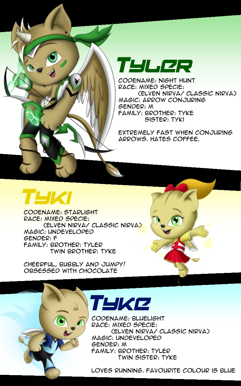 Tyke, Tyki, Tyler, Tierra and Ted were 5 Nirvas bound by an Aura Pact with their Master, Jeff. Tragically when their Aura Pact shattered, the Nirvas were forced back to where they came from, Nirvalius. Adapting life here would be very different from the human world, wouldn't it?