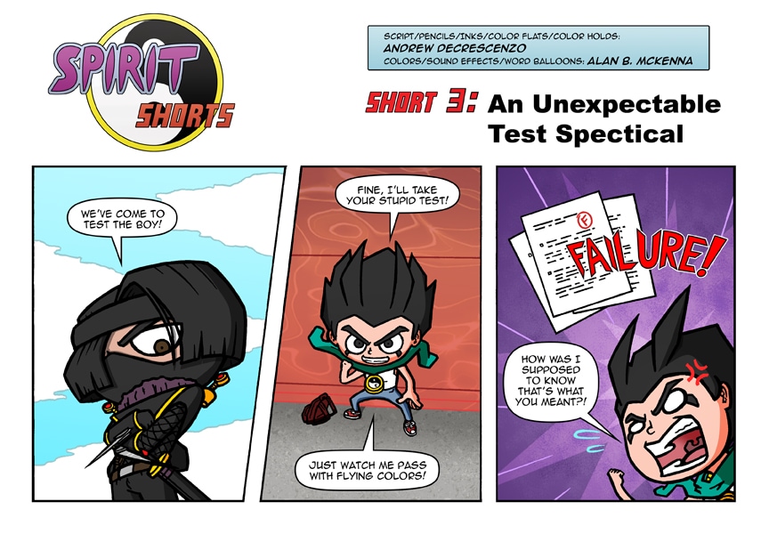 The bonus comic strip corresponding with Spirit Legends issue 3. Script, Line Art, and Color Assistance by me, Andrew DeCrescenzo Colors and Sound Effects by Alan B. McKenna