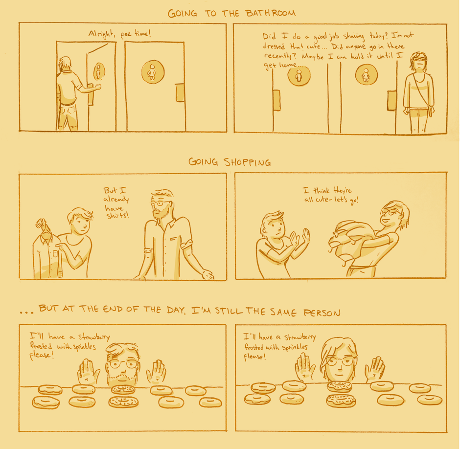 I had been transitioning for a couple of months when I wrote this, and I wanted to try to capture some of the little moments of my transition with this comic. Probably my favorite thing so far is that I feel much more in touch with my emotions - whether that’s a hormone thing or a psychological thing, I feel emotions much more strongly, and I feel very liberated in expressing them (mostly through crying).