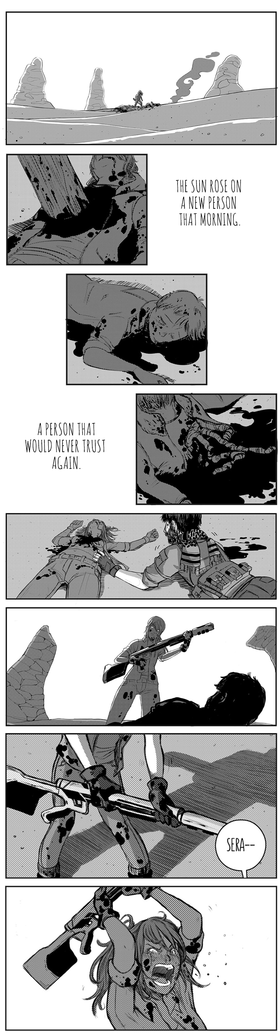 Sera was forged in the fires of the apocalypse and hardened by the world around her. After years alone, she makes her way towards a city where peace and civilization are being reborn. Along the way, she picks up some unexpected company... But, is Sera ready to live amongst her own kind again? Adventure ensues when monsters, lasers and bad asses collide!