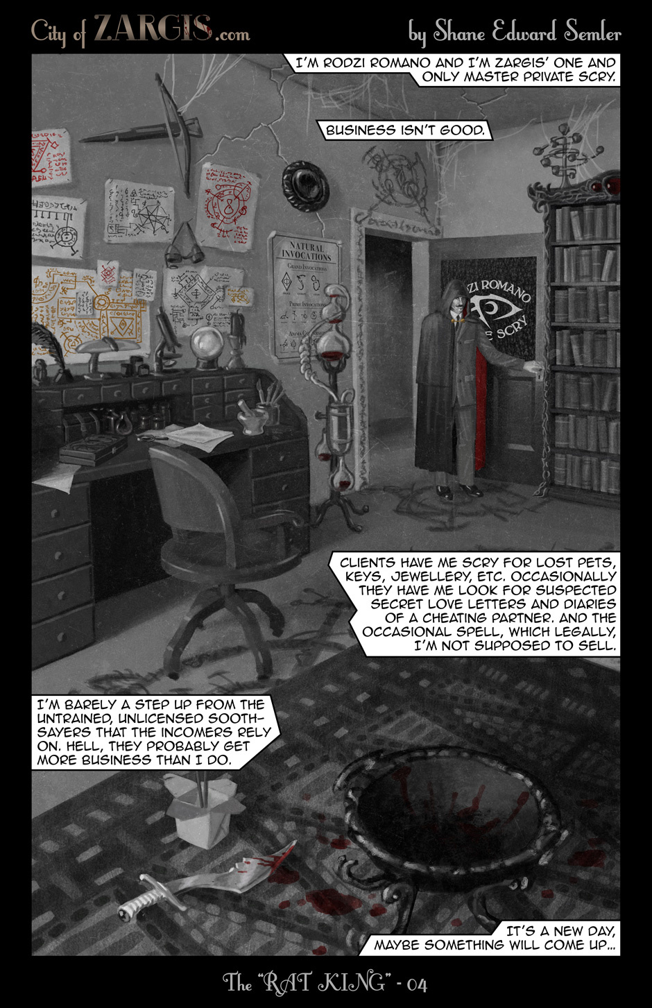In "The 'Rat King', Rodzi Romano, Zargis’ only Master Private Scry, begins his day searching for a missing person but before the end will be drawn into a murderous corporate conspiracy.