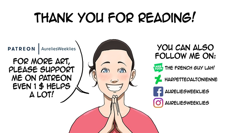 Note: Tapas will be updated weekly until I catch up with webtoon.com then I will post once a month. For weekly illustrations, you can check my patreon or Facebook (Aurelie's weeklies). If you want faster updates, you can consider becoming a patron ;)