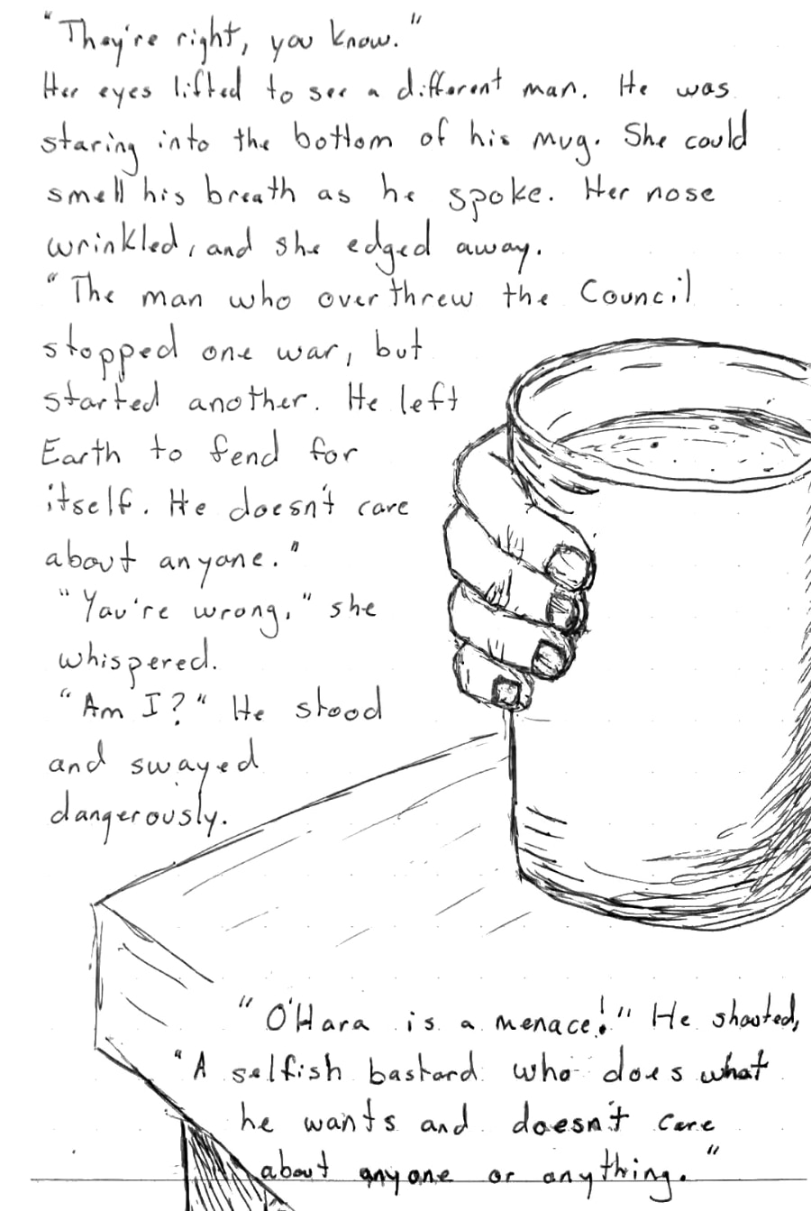 “We were better off back in the old days with the Council, before all this friendly crap with the Zarweans.” One of the men turned his head toward the floor to express his feelings and then stopped when he saw the girl. He nodded at her and chugged the spittle down with a swig from his mug.