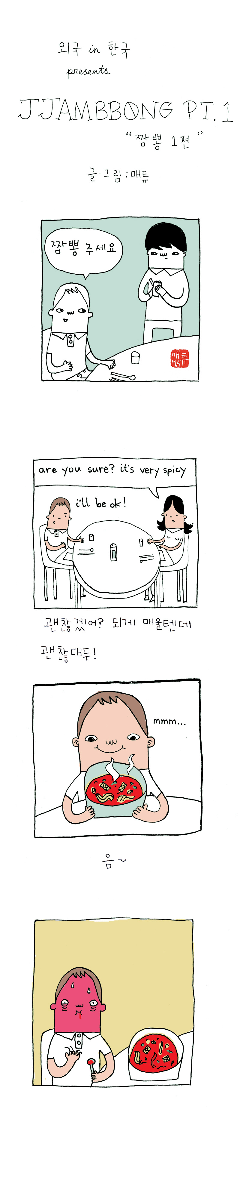 Jjambbong is a Korean/Chinese super spicy soup dish. In the first panel I am saying 'Jjambbong please' (jjam-bbong ju-se-yo).