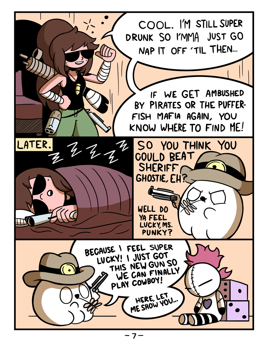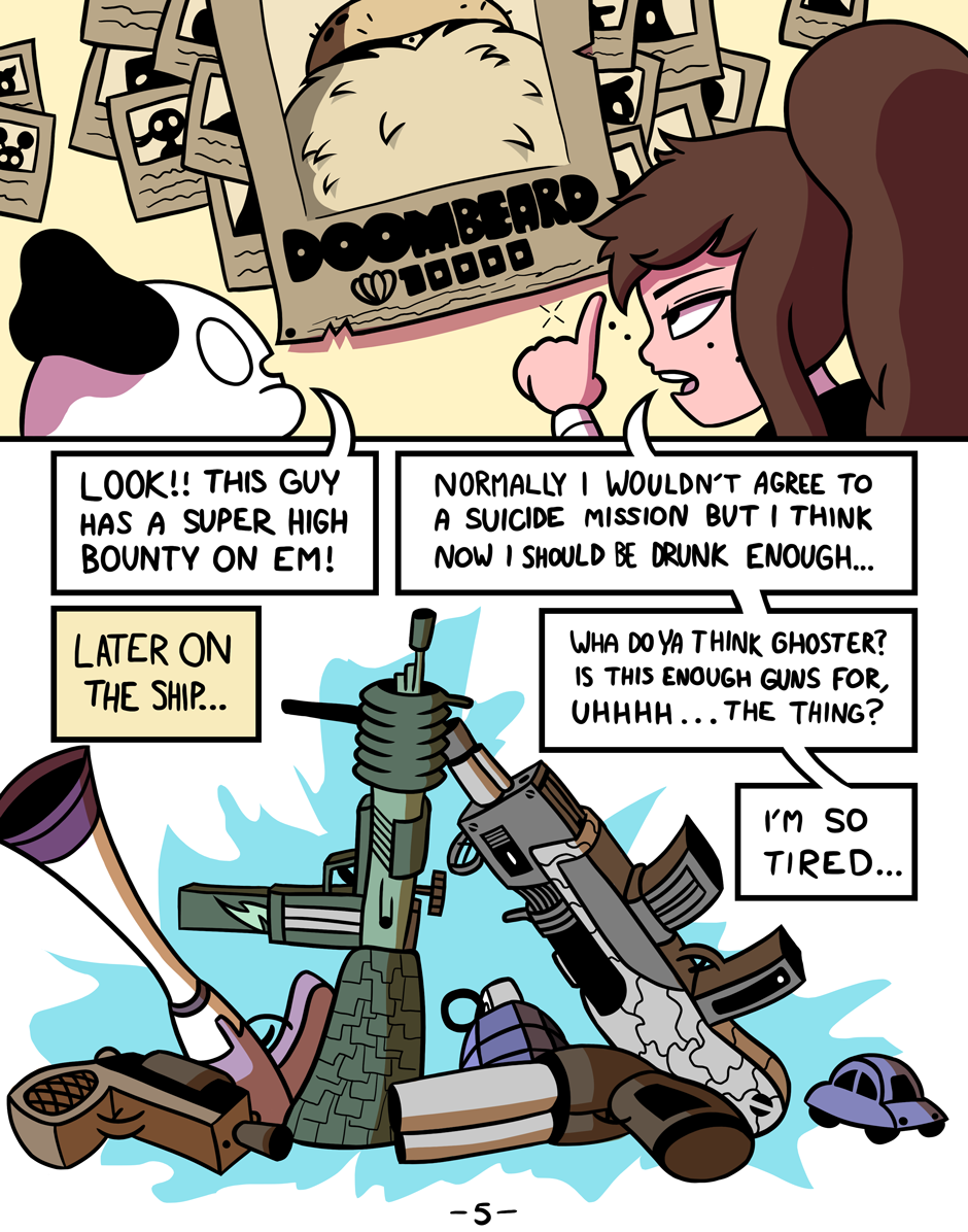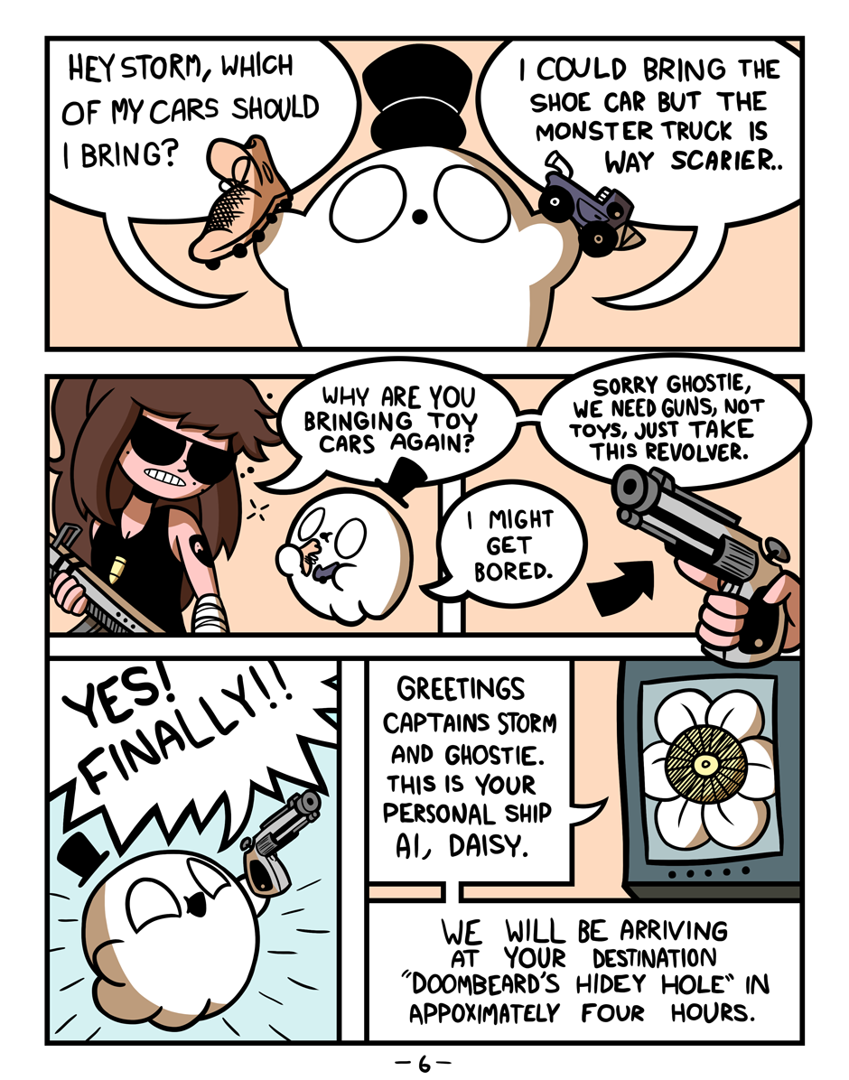 Meet Storm, an aspiring young bounty hunter and psychopath, and Ghostie, the Sea's Ghostiest Ghost. Together, they travel The Great Open Sea in search of riches and adventure amongst countless crooks and thieves and monstrosities. Storm may have a whole lotta guns and the skills to boot, but together, Storm and Ghostie will learn what's even stronger than immense firepower...the power of friendship! (And even more firepower.)