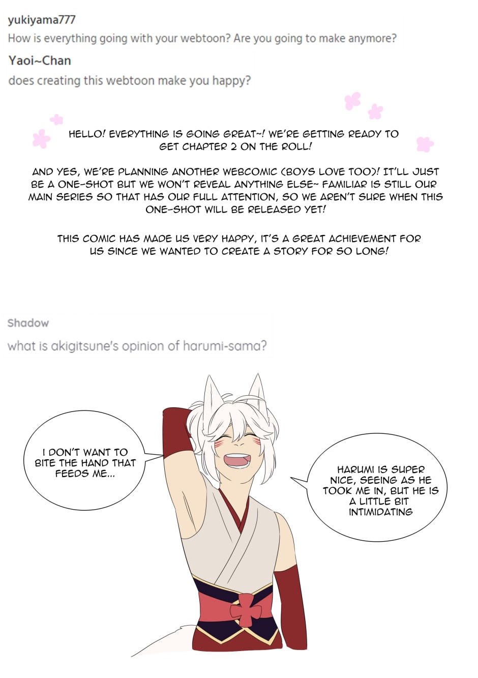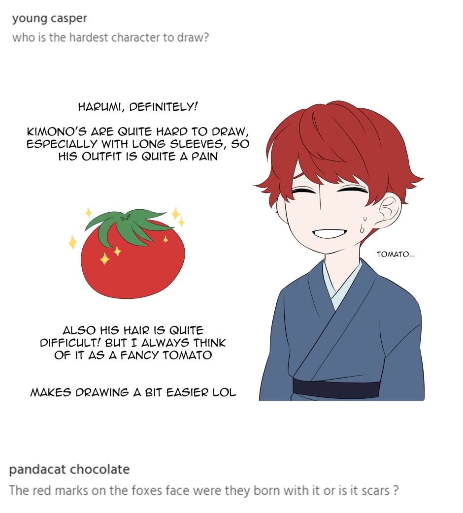 Thank you all for the wait, here are answers to the questions we got over the weeks! Next update for the start of chapter 2 will be in a fortnight! Thank you for your patience!