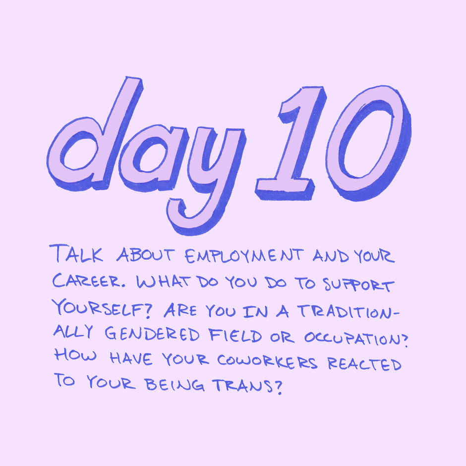 Day 10 - Career! I’m very fortunate to have really supportive coworkers and an awesome HR team at my place of business - many transgender people work in unsupportive or even hostile environments, and it’s much harder for transgender people to find work. A survey of transgender people conducted in 2015 found that the unemployment rate among respondents was about 15% - three times the national average of 5%. And 30% of respondents said they were fired, denied a promotion, or experienced some other form of mistreatment at their job.