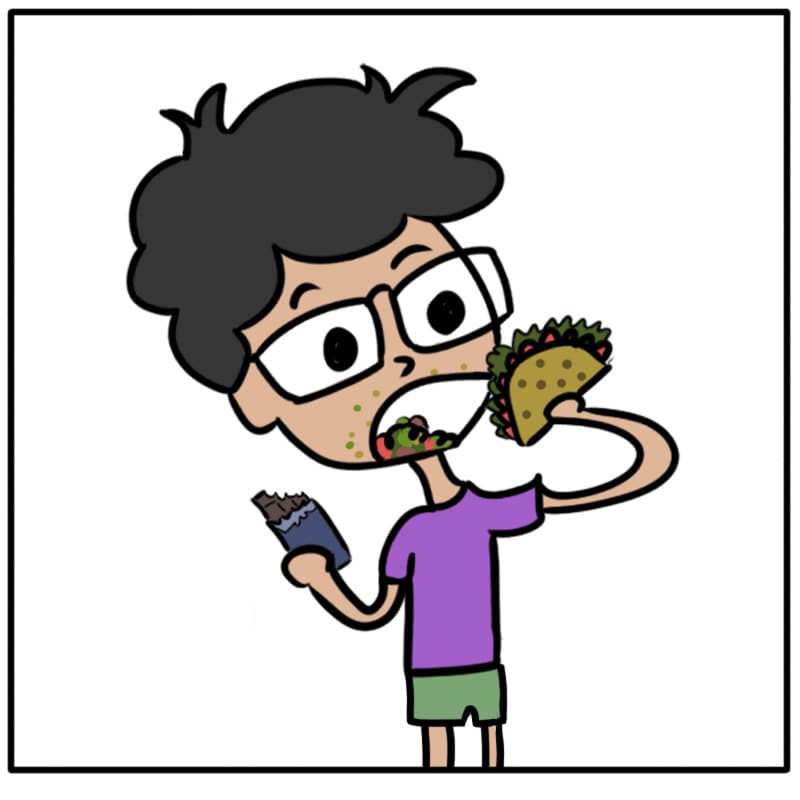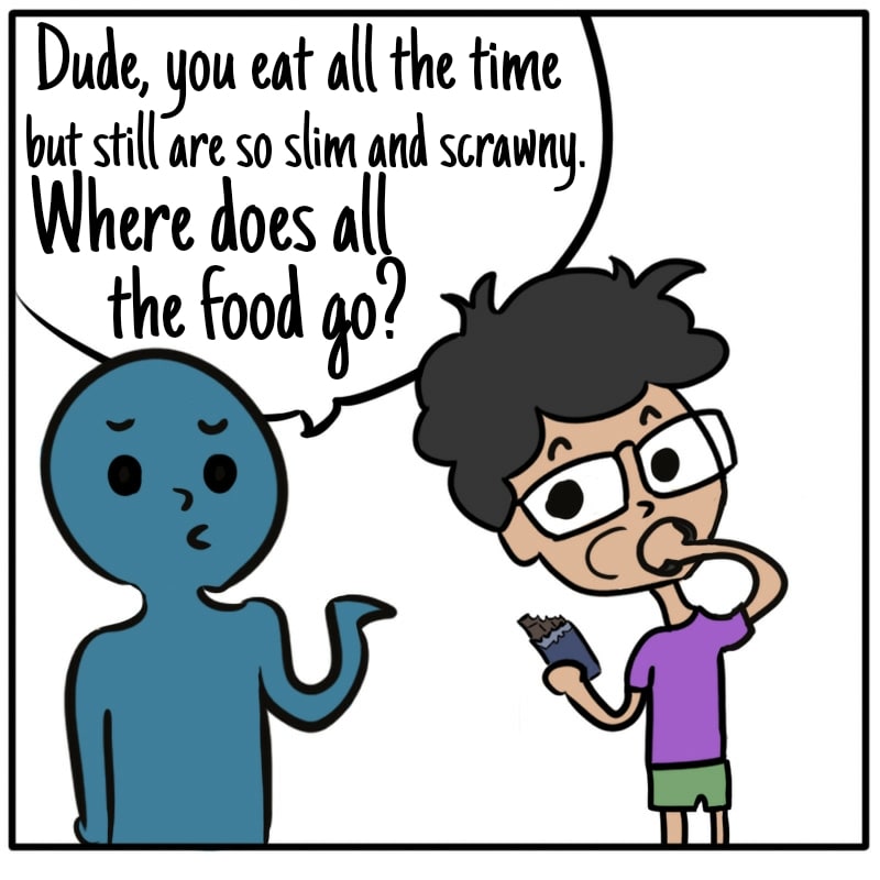 Ugh xD thats my bf and two sons. They always eat and dont gain a pound. I eat once sometimes twice a day and boom pounds gained T.T enjoy the high metabolism while it lasts. Also could possibly be attrubited to thyroid problem which would be best to have checked xD