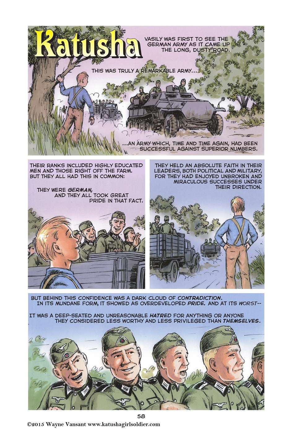 The story opens with Katusha’s graduation from her tenth and final year of school. The next morning, Sunday June 22, 1941, Nazi Germany invades the Soviet Union. The girl and her family flee to the forests to begin a partisan war against the German occupiers. Finally, Katusha enters the Red Army where she is trained as a tank driver. Her unit fights in the battles of Stalingrad and Kursk, and then pushes the Germans across Ukraine into Poland. By 1945, Katusha commands her own tank, and takes part in the final battle for Berlin.Katusha is not just a story of “good guys vs bad guys”. The war in Eastern Europe and the Soviet Union was a confusing conflict between two brutal dictators, Hitler and Stalin, and for the people caught between them choosing sides was a difficult decision.