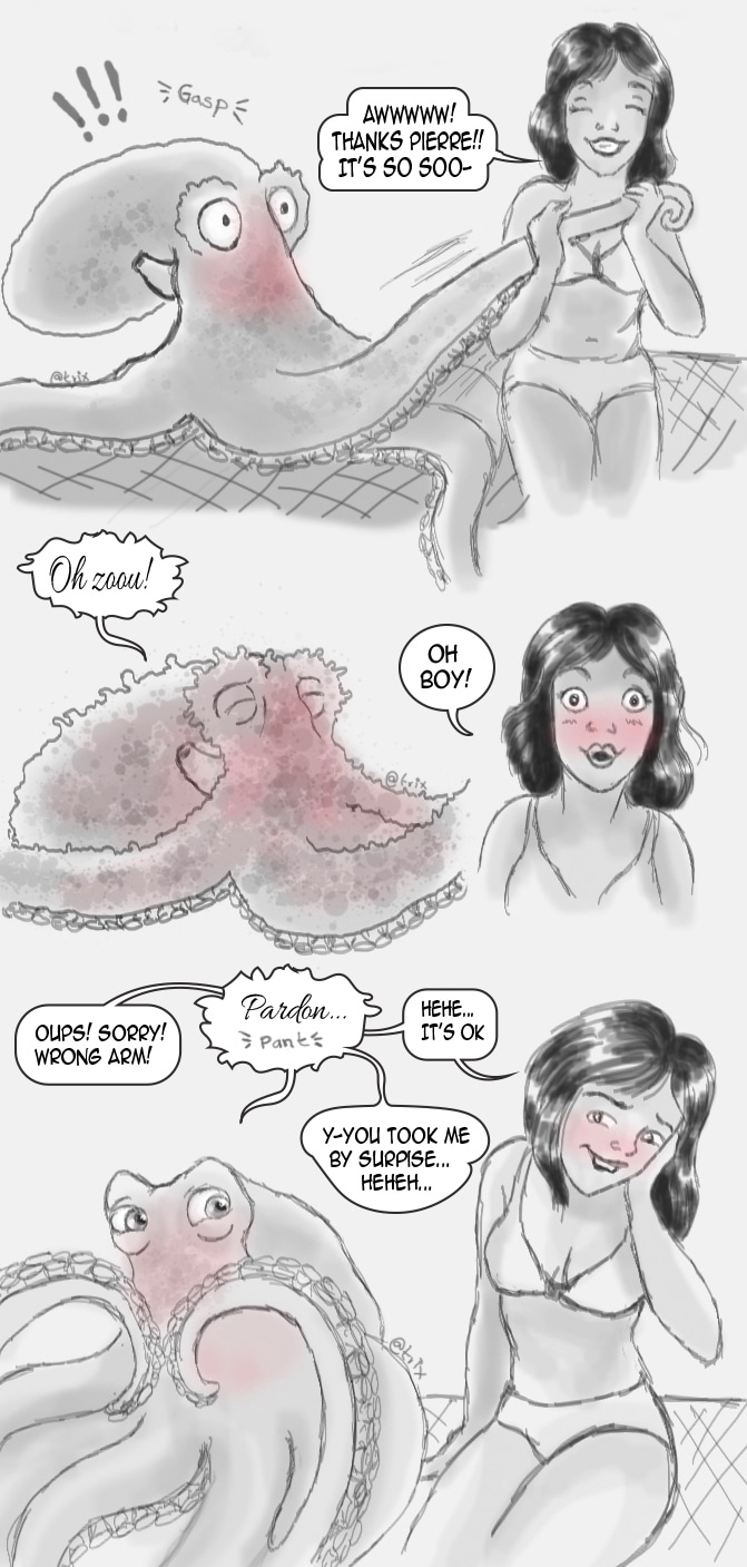 When I drew this I wanted to practice Pierre’s expressions mostly, and also to give him a couple of better character design features like for example, he will change of texture and color of his skin when feeling a strong emotion, like when he’s too happy or amazed, or feary…or when he’s took by surprise like he does in this comic :)