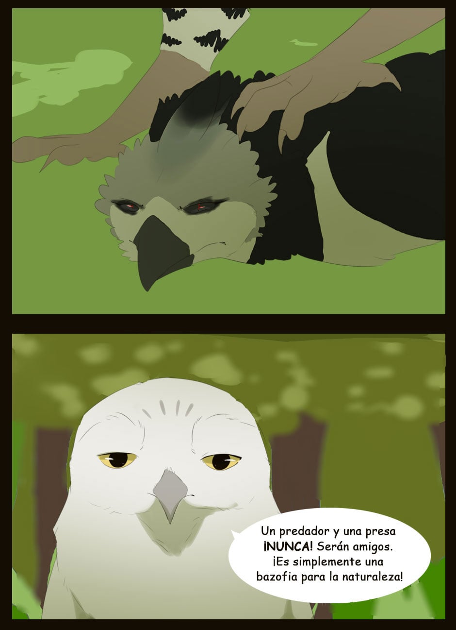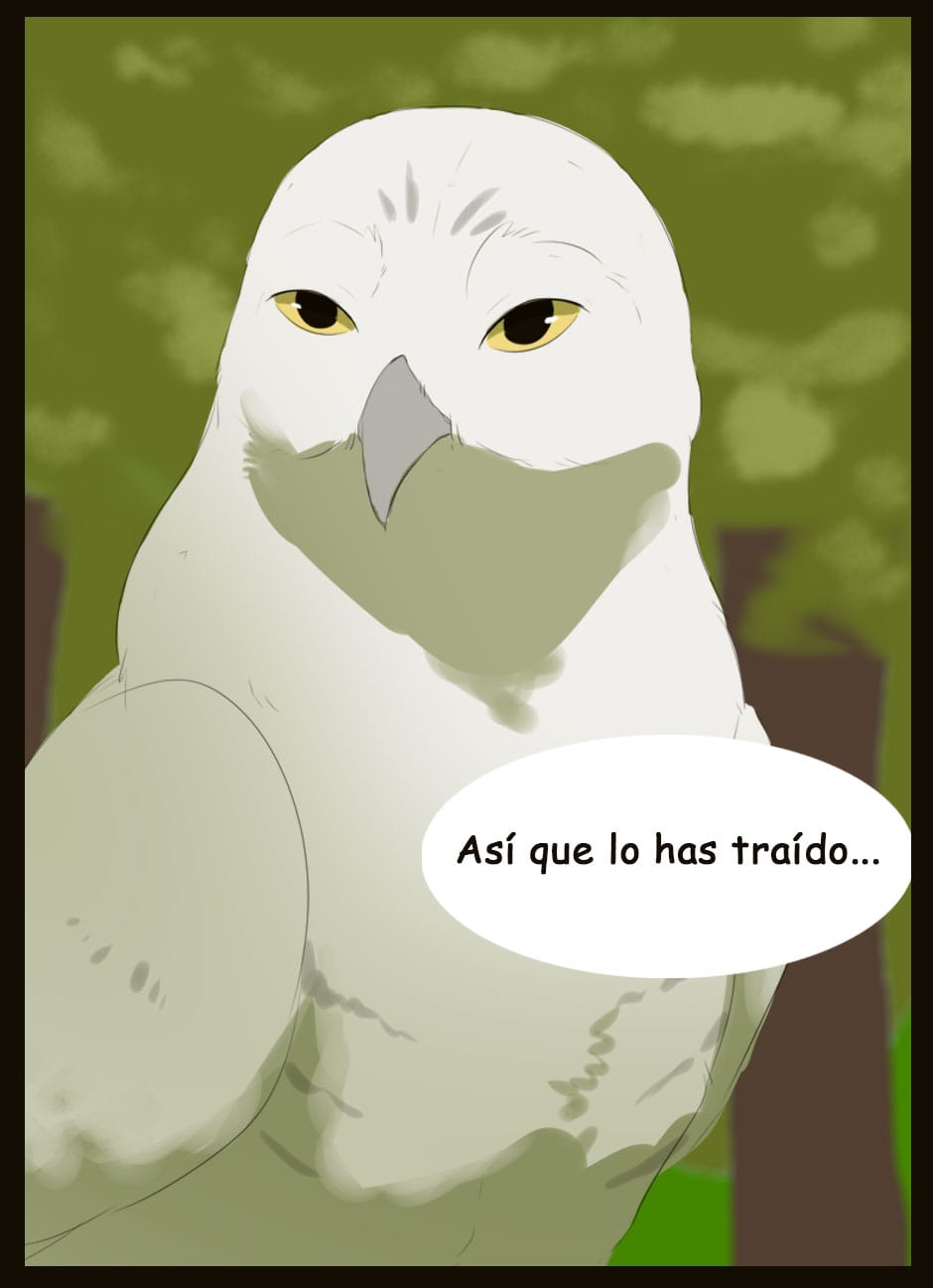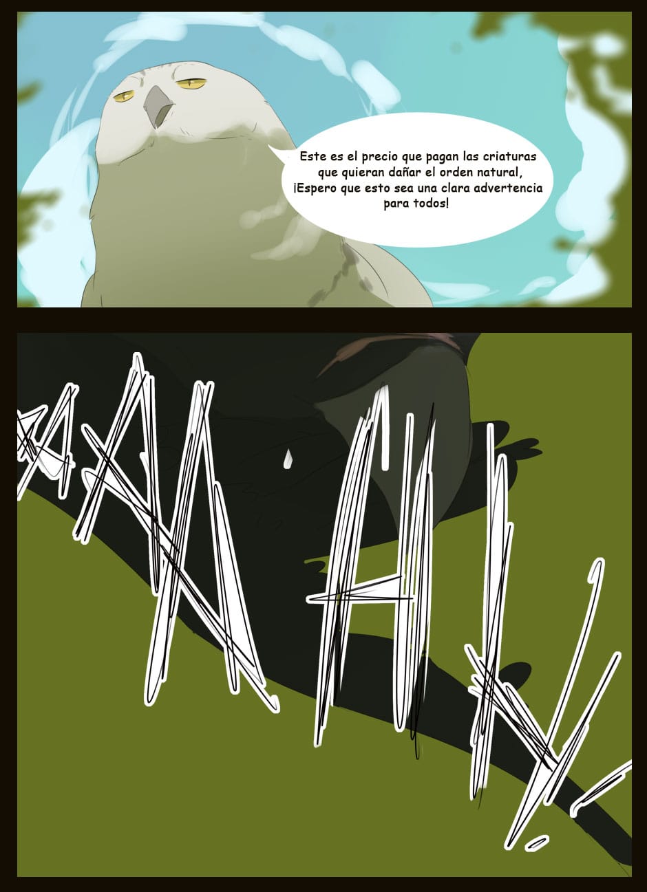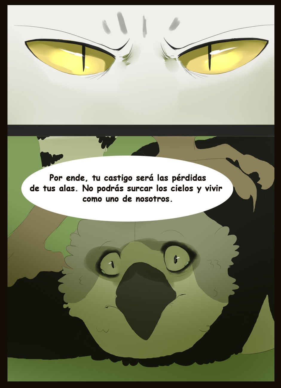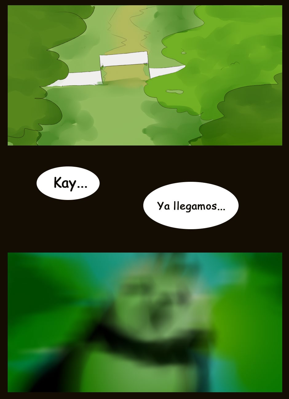Me gusta como eres capaz de dar expresividad a unas caras que de natural no lo serían para nada :D Vigila, a veces la luz que se filtra entre las hojas la haces una mancha de bordes difuminados y otra s veces de bordes duros. Sobre el texto, te sigo diciendo que tengas cuidado. Hay lugares en los que pones coma dónde no deberías (por ejemplo, en la quinta viñeta, en "pero, nada paso"... Dónde también hace falta tilde). Cuidado con los acentos, te faltan unos cuantos y lo de la fuente de letra estaría bien mirarlo.