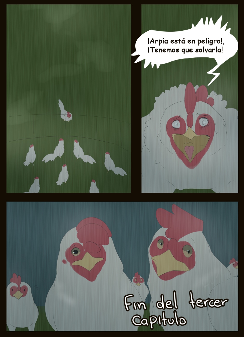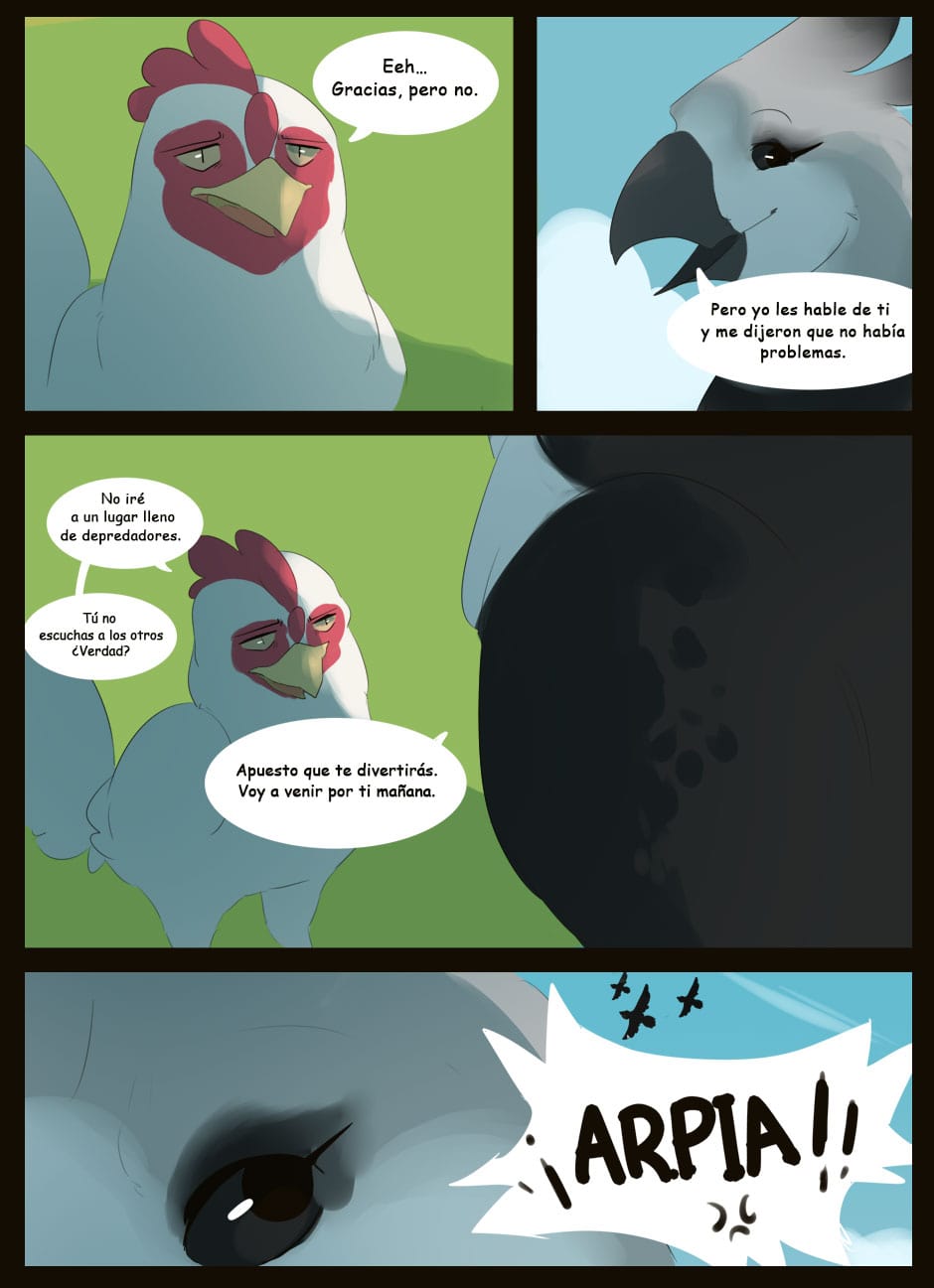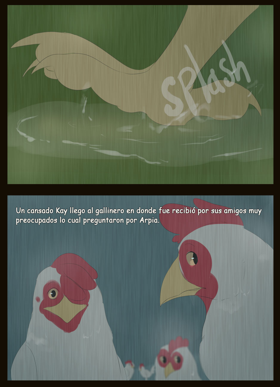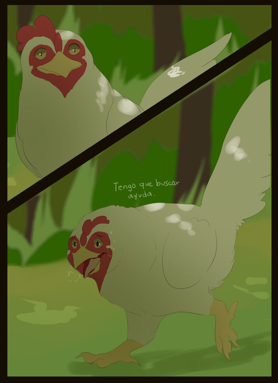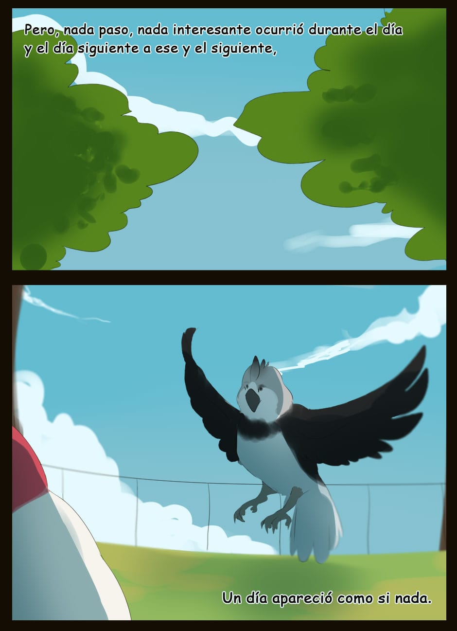 Me gusta como eres capaz de dar expresividad a unas caras que de natural no lo serían para nada :D Vigila, a veces la luz que se filtra entre las hojas la haces una mancha de bordes difuminados y otra s veces de bordes duros. Sobre el texto, te sigo diciendo que tengas cuidado. Hay lugares en los que pones coma dónde no deberías (por ejemplo, en la quinta viñeta, en "pero, nada paso"... Dónde también hace falta tilde). Cuidado con los acentos, te faltan unos cuantos y lo de la fuente de letra estaría bien mirarlo.