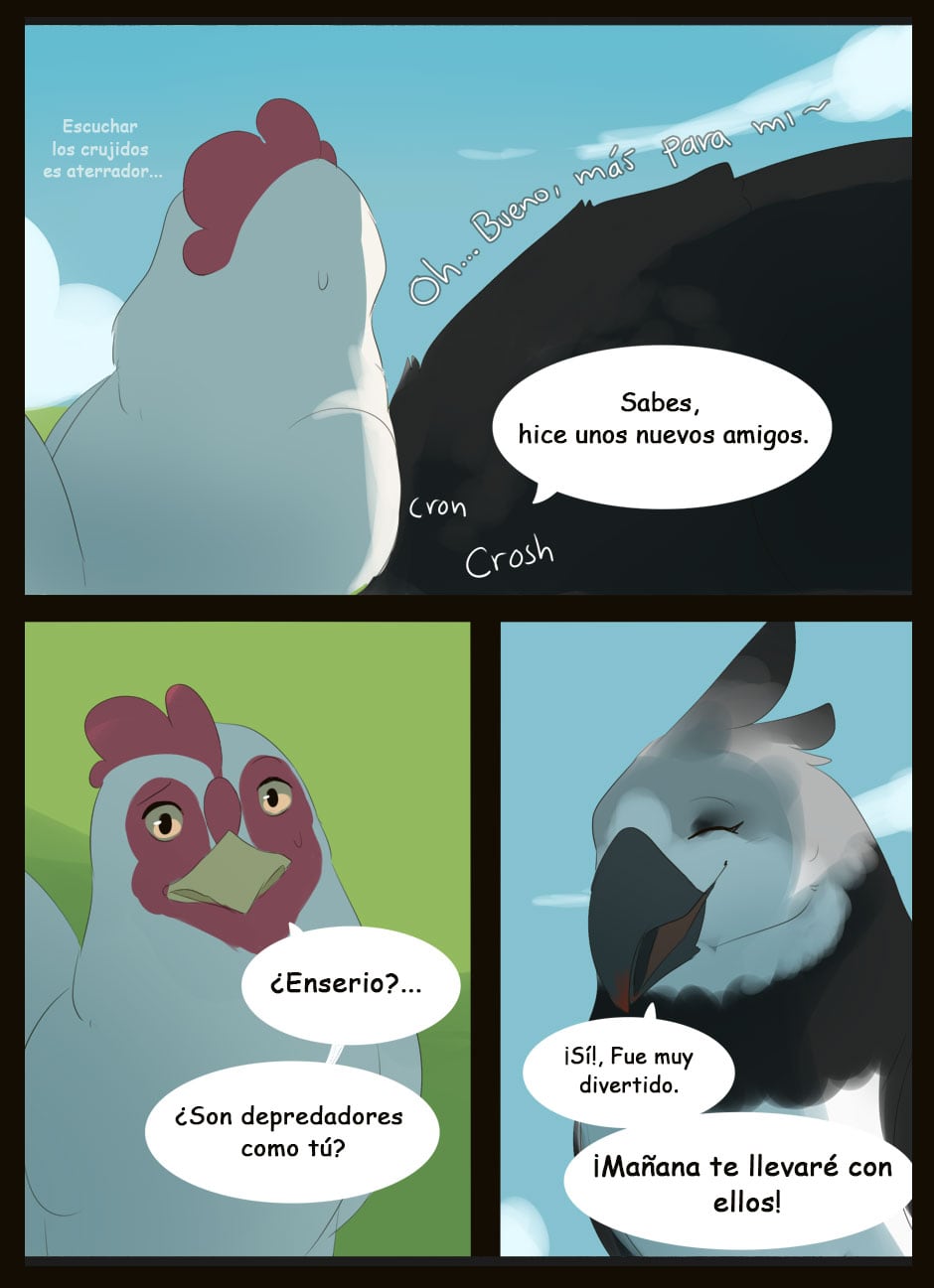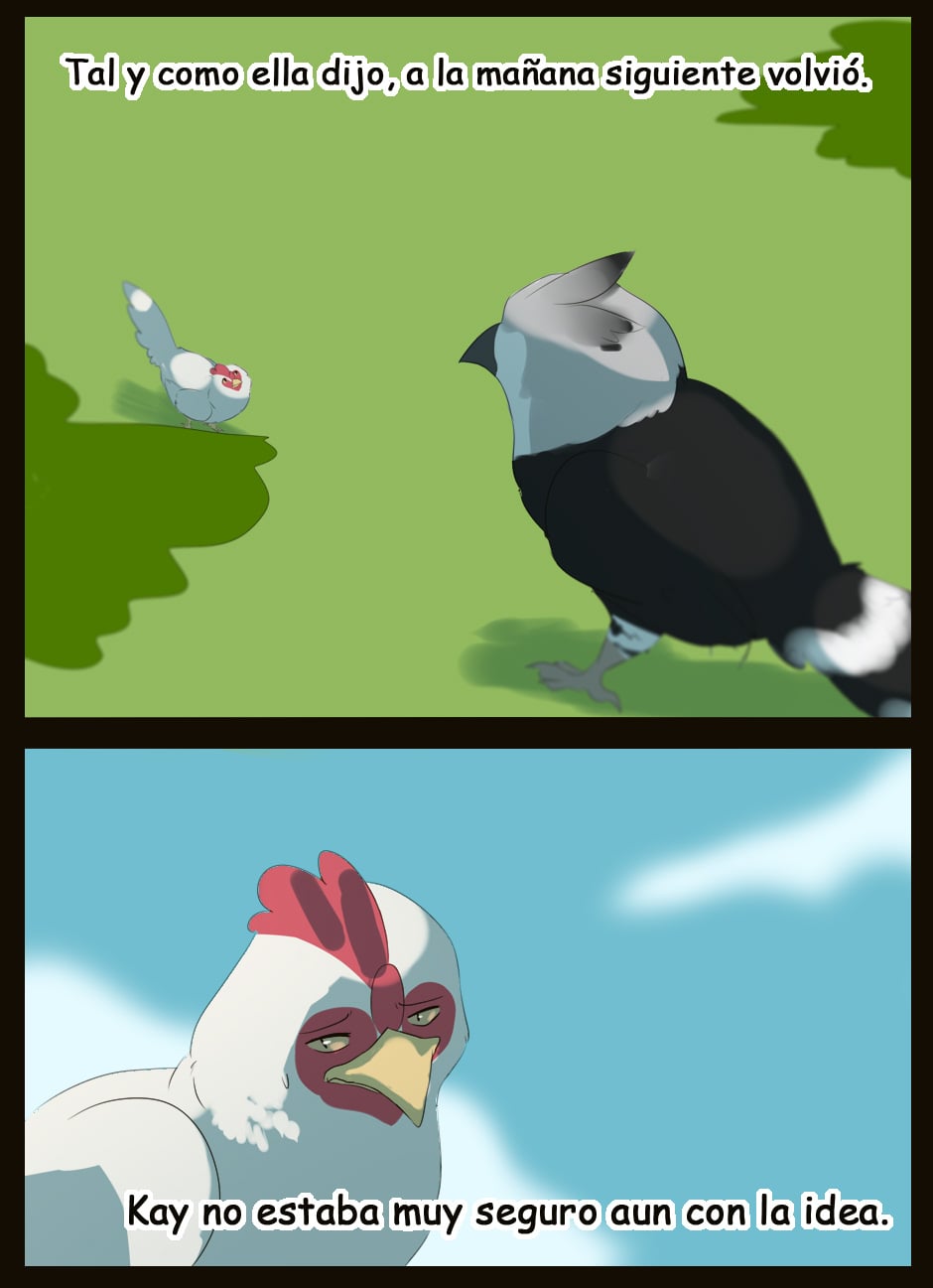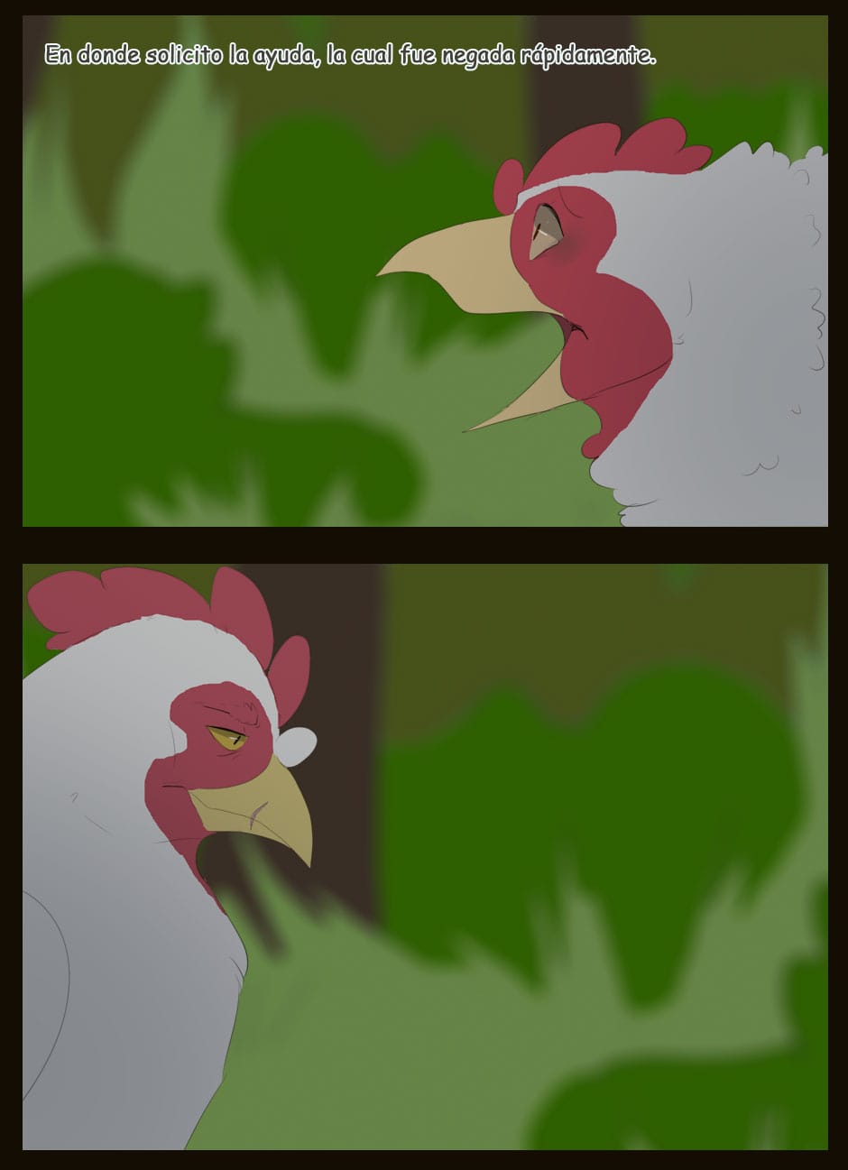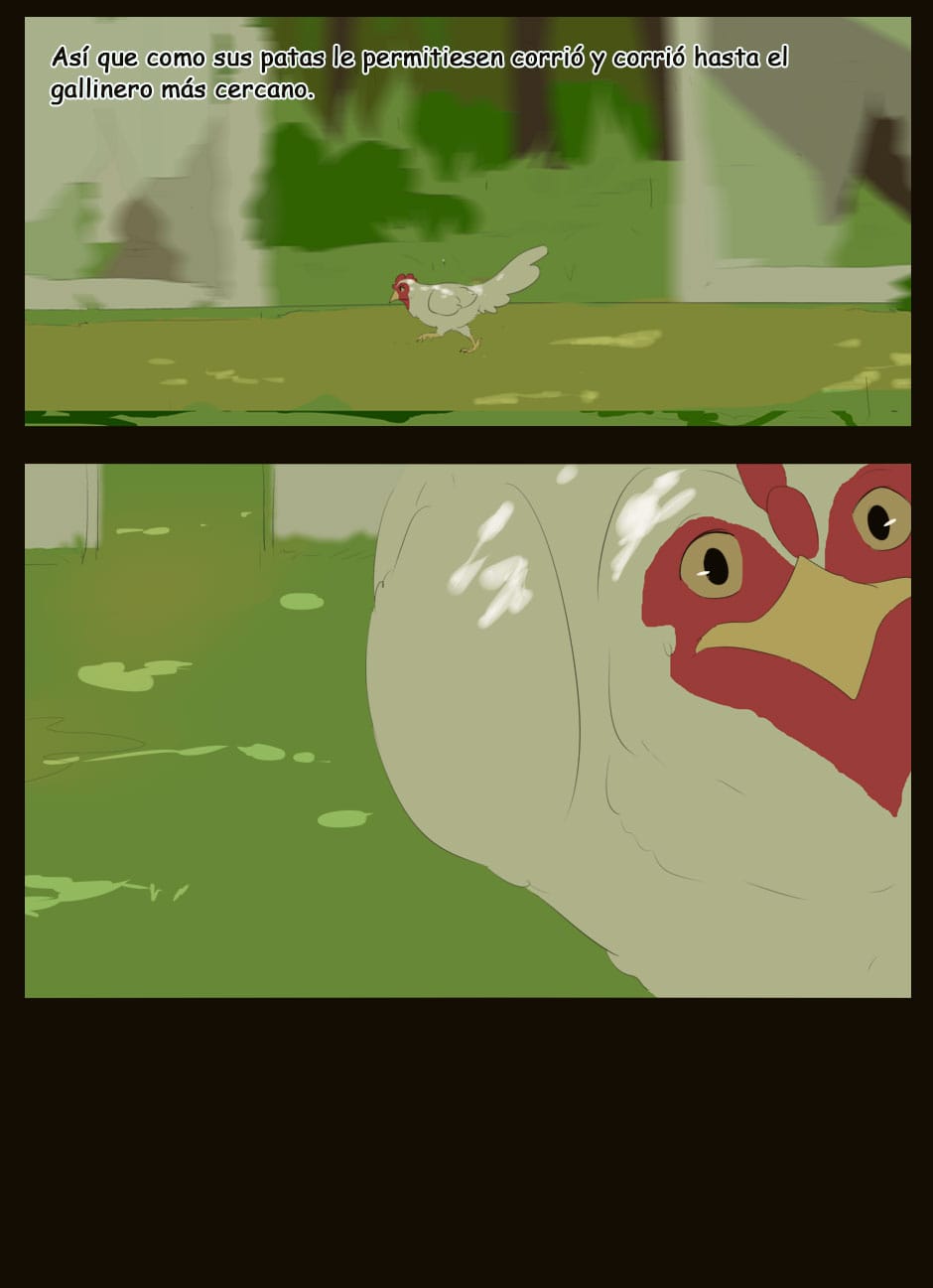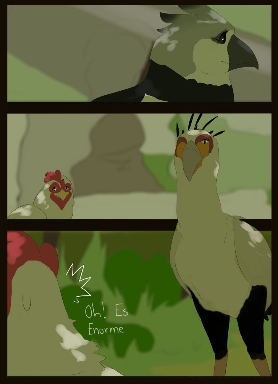 Me gusta como eres capaz de dar expresividad a unas caras que de natural no lo serían para nada :D Vigila, a veces la luz que se filtra entre las hojas la haces una mancha de bordes difuminados y otra s veces de bordes duros. Sobre el texto, te sigo diciendo que tengas cuidado. Hay lugares en los que pones coma dónde no deberías (por ejemplo, en la quinta viñeta, en "pero, nada paso"... Dónde también hace falta tilde). Cuidado con los acentos, te faltan unos cuantos y lo de la fuente de letra estaría bien mirarlo.