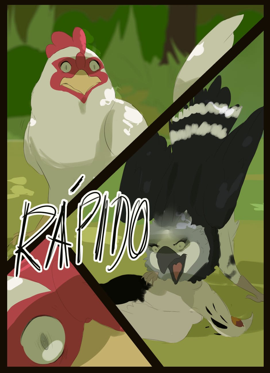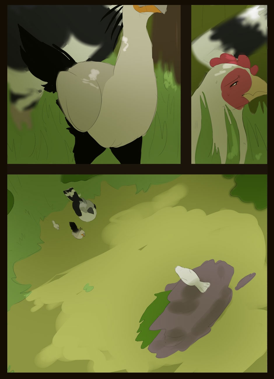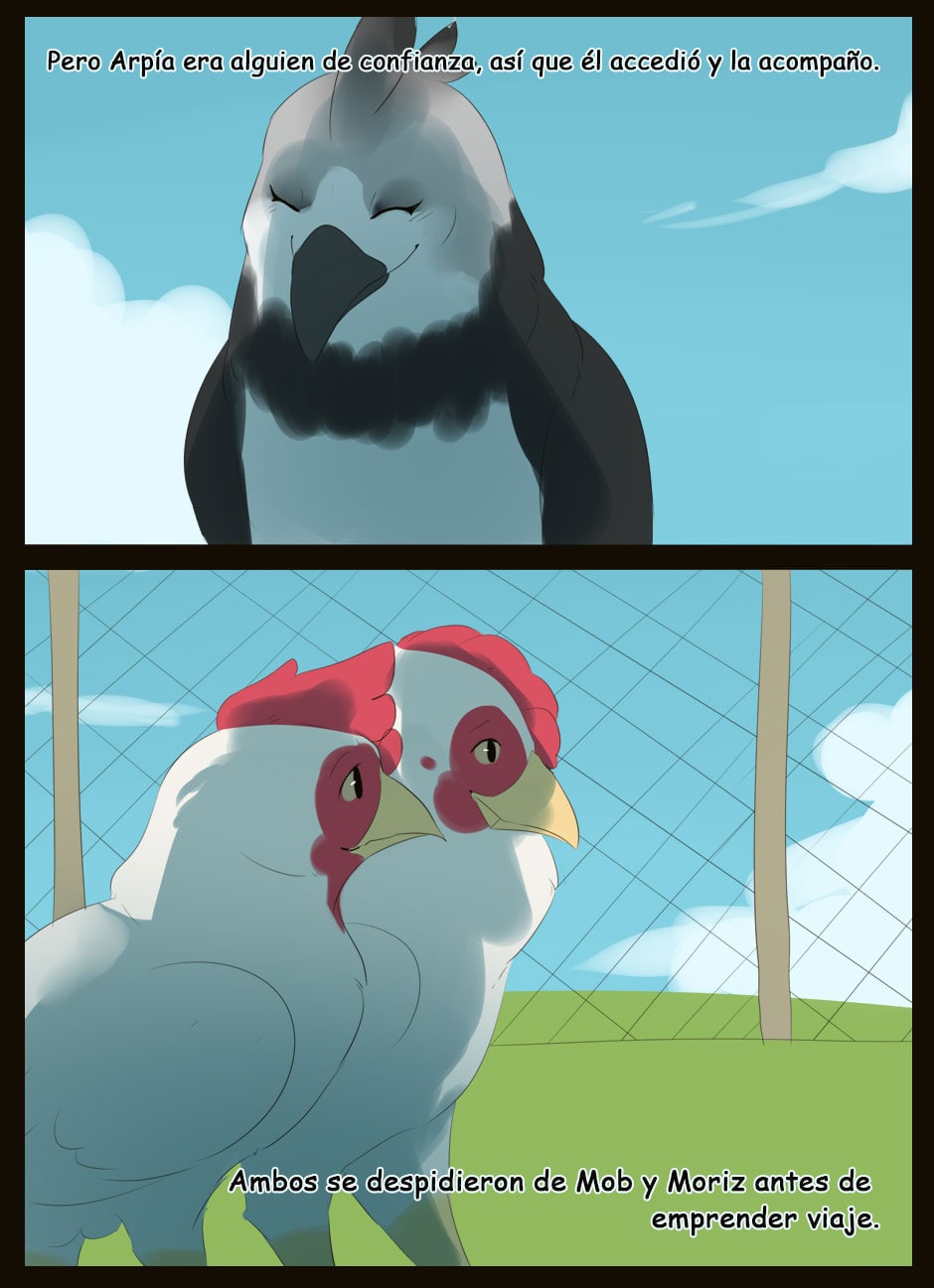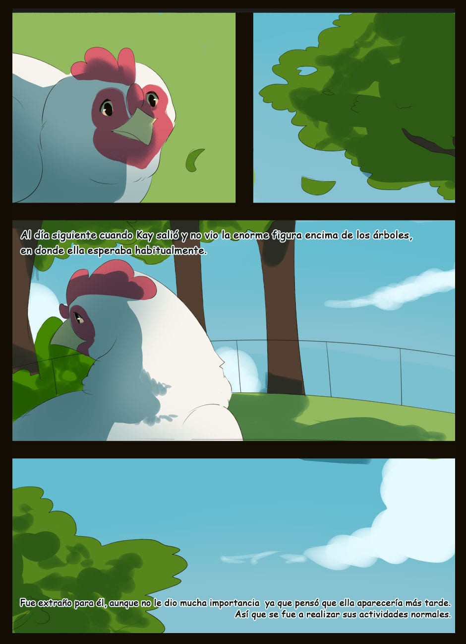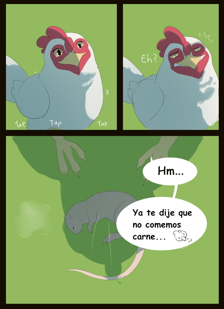 Me gusta como eres capaz de dar expresividad a unas caras que de natural no lo serían para nada :D Vigila, a veces la luz que se filtra entre las hojas la haces una mancha de bordes difuminados y otra s veces de bordes duros. Sobre el texto, te sigo diciendo que tengas cuidado. Hay lugares en los que pones coma dónde no deberías (por ejemplo, en la quinta viñeta, en "pero, nada paso"... Dónde también hace falta tilde). Cuidado con los acentos, te faltan unos cuantos y lo de la fuente de letra estaría bien mirarlo.