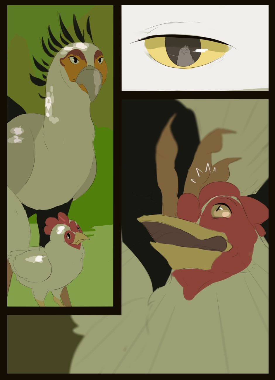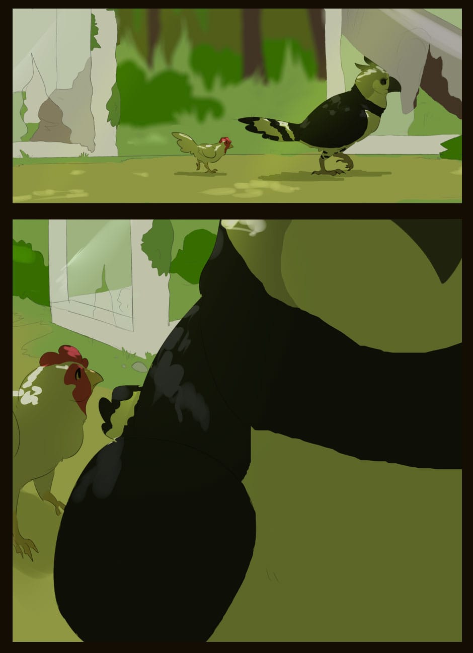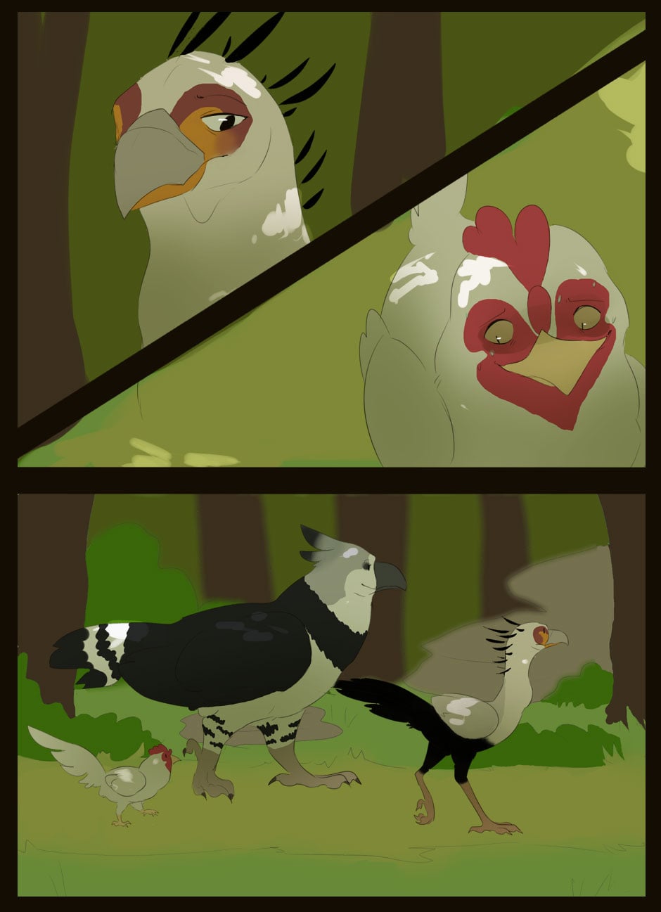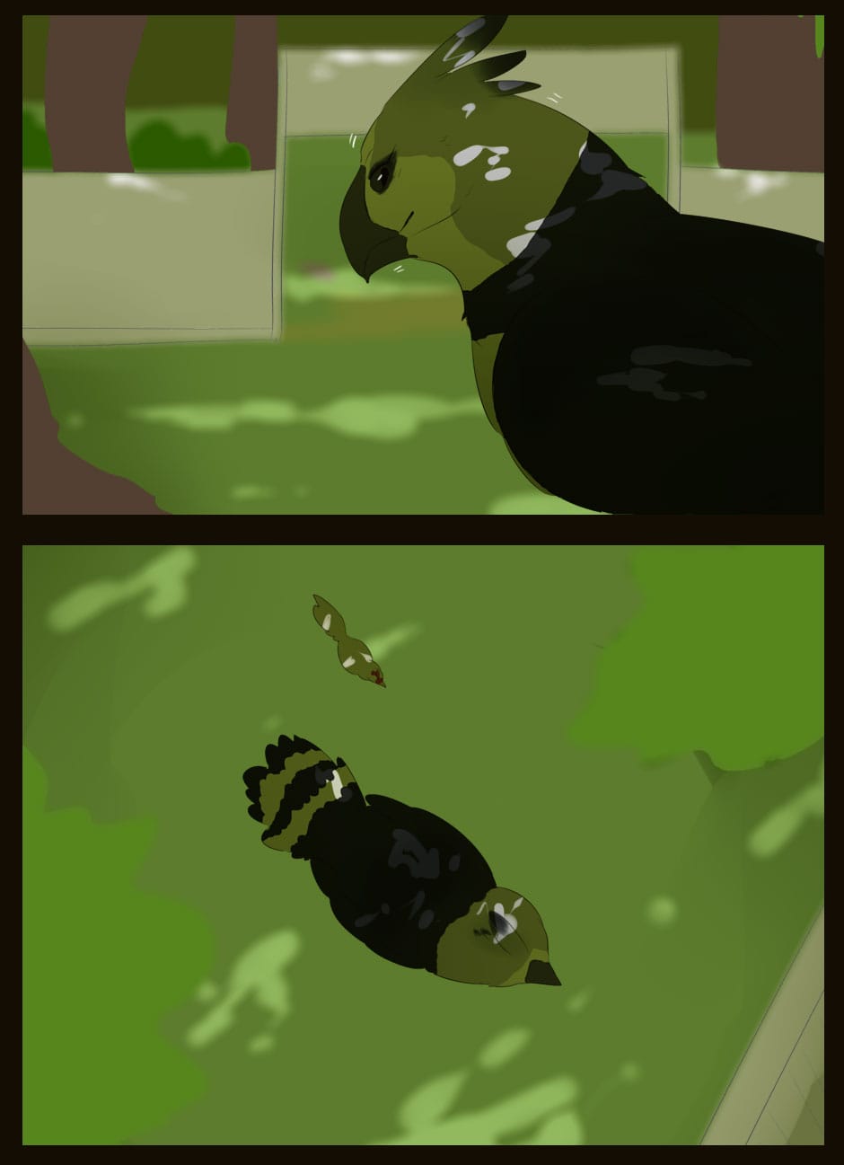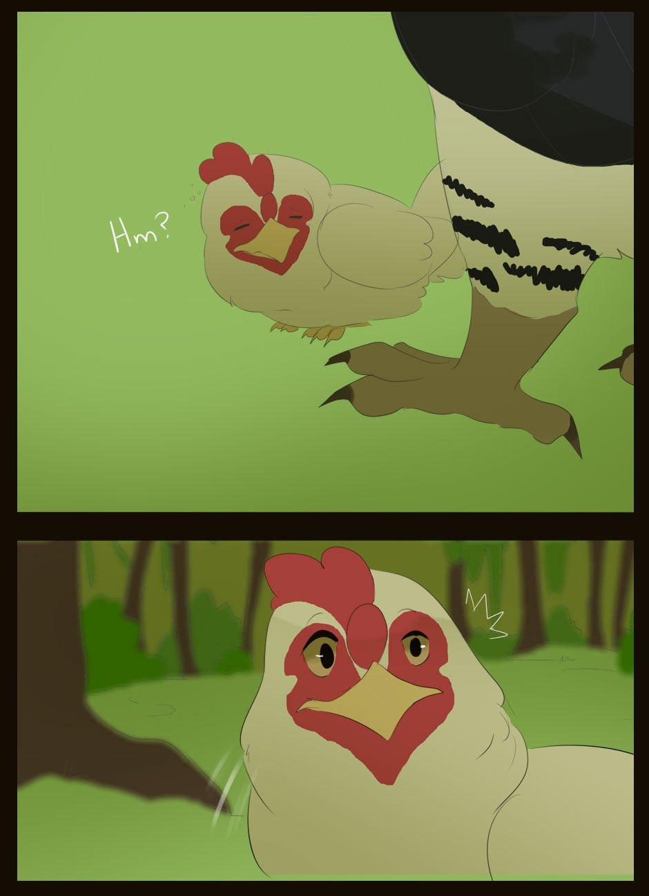 Me gusta como eres capaz de dar expresividad a unas caras que de natural no lo serían para nada :D Vigila, a veces la luz que se filtra entre las hojas la haces una mancha de bordes difuminados y otra s veces de bordes duros. Sobre el texto, te sigo diciendo que tengas cuidado. Hay lugares en los que pones coma dónde no deberías (por ejemplo, en la quinta viñeta, en "pero, nada paso"... Dónde también hace falta tilde). Cuidado con los acentos, te faltan unos cuantos y lo de la fuente de letra estaría bien mirarlo.