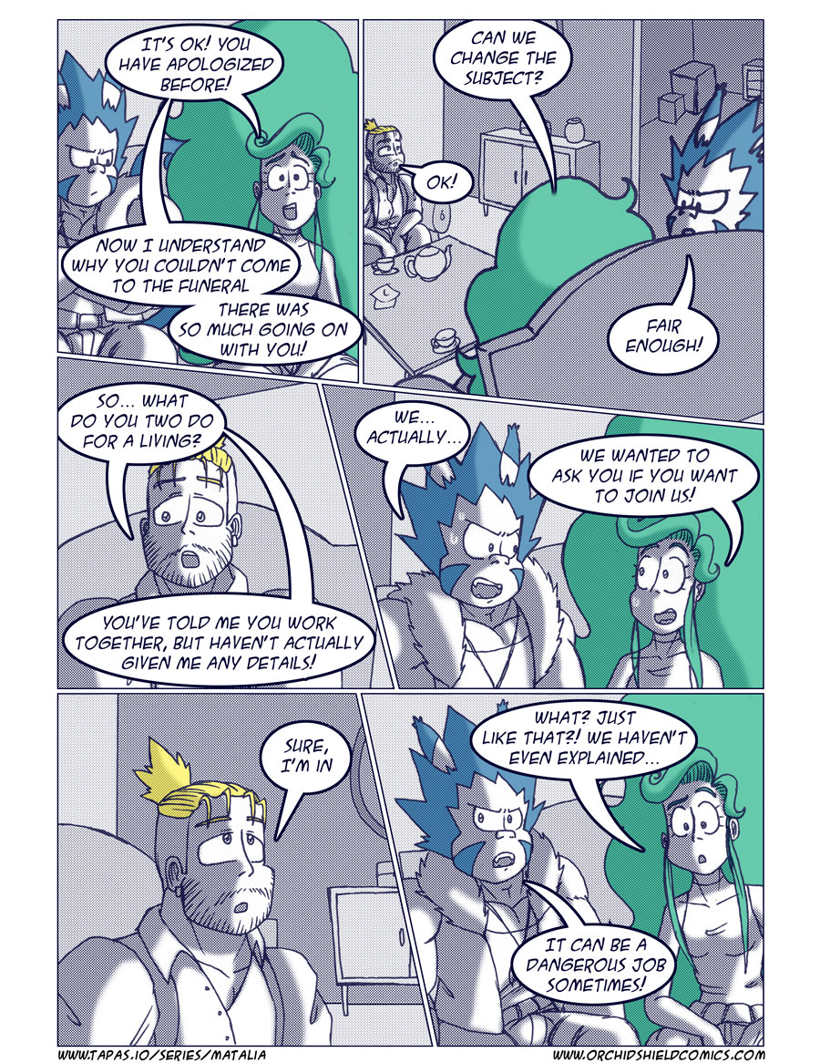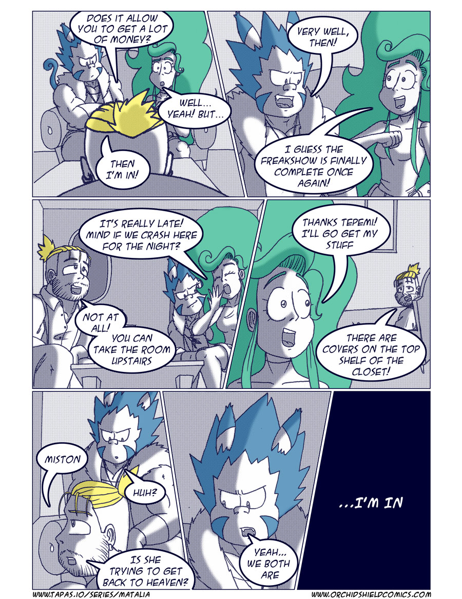 Matalia is a 16 year old treasure hunter with mysterious powers and magical green hair. Along with her firends Miston, a giant rabbicat with super strength, and Tepemi, a psychic fish man, they form the gang called "The Freakshow"