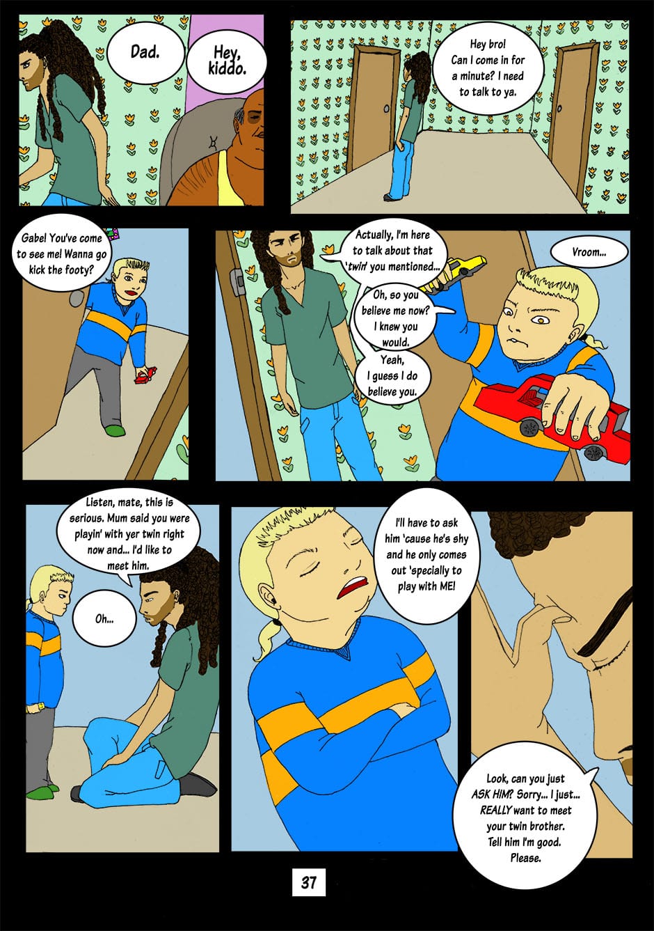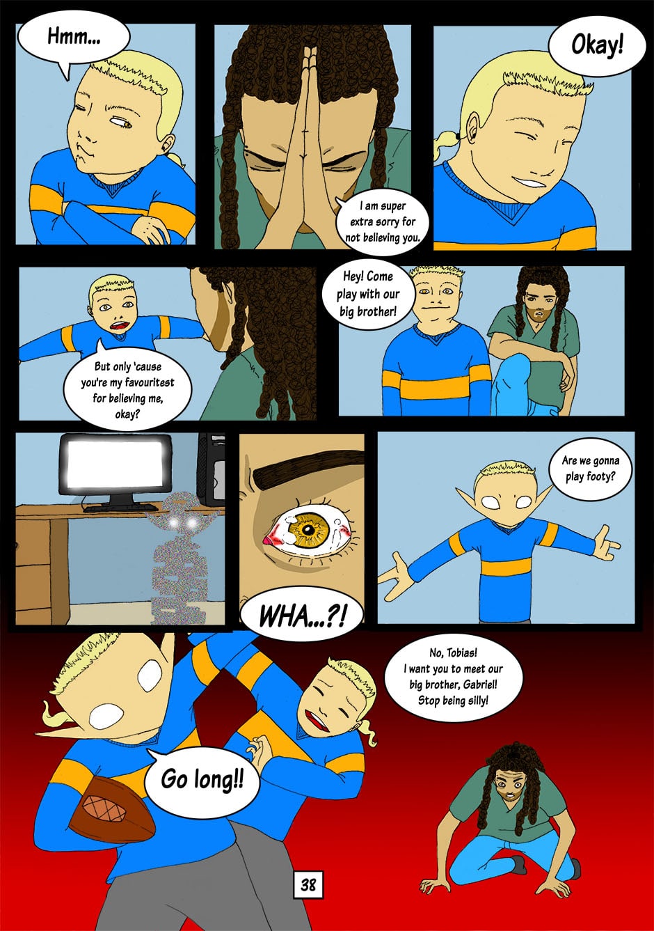 A twin? It can't be! Could this be the thing that Tobias was talking about? No, it can't be. There must be a reasonable explanation for all of this. Gabriel hurries to find Tobias in order to get to the bottom of what's been going on. He is still very surprised by what he finds... [Note: Promised bonus pages delivered! I hope you enjoy them and I'll see you all on Monday when I upload some more!]