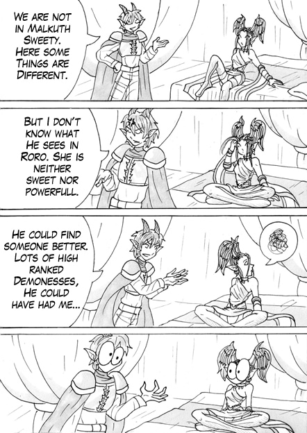 The Demon Roro works in Kether (Heaven) as a Guard for special Angelblossoms. Unfortunately, one gets lost through a Dimension Hole and Roro has to bring it back. In Malkuth a witch named Nene also wants the Blossom because of a Mistake- she thinks it is a precious treasure. But both lose the Blossom to the Ruler of Hell, with whom Roro has a very special connection.