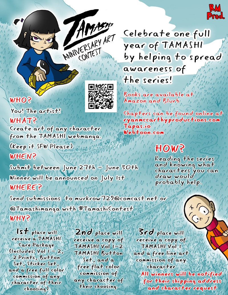 I am super pleased to announce the first ever Tamashi art contest! From now until June 30th, talented artists in the community will have a chance to win a special Tamashi Care Package and a free commission by making an art piece of any character that has appeared in the manga so far. All entries will be displayed at ryanmccarthyproductions.com. Read up and put your artistic talents to use!